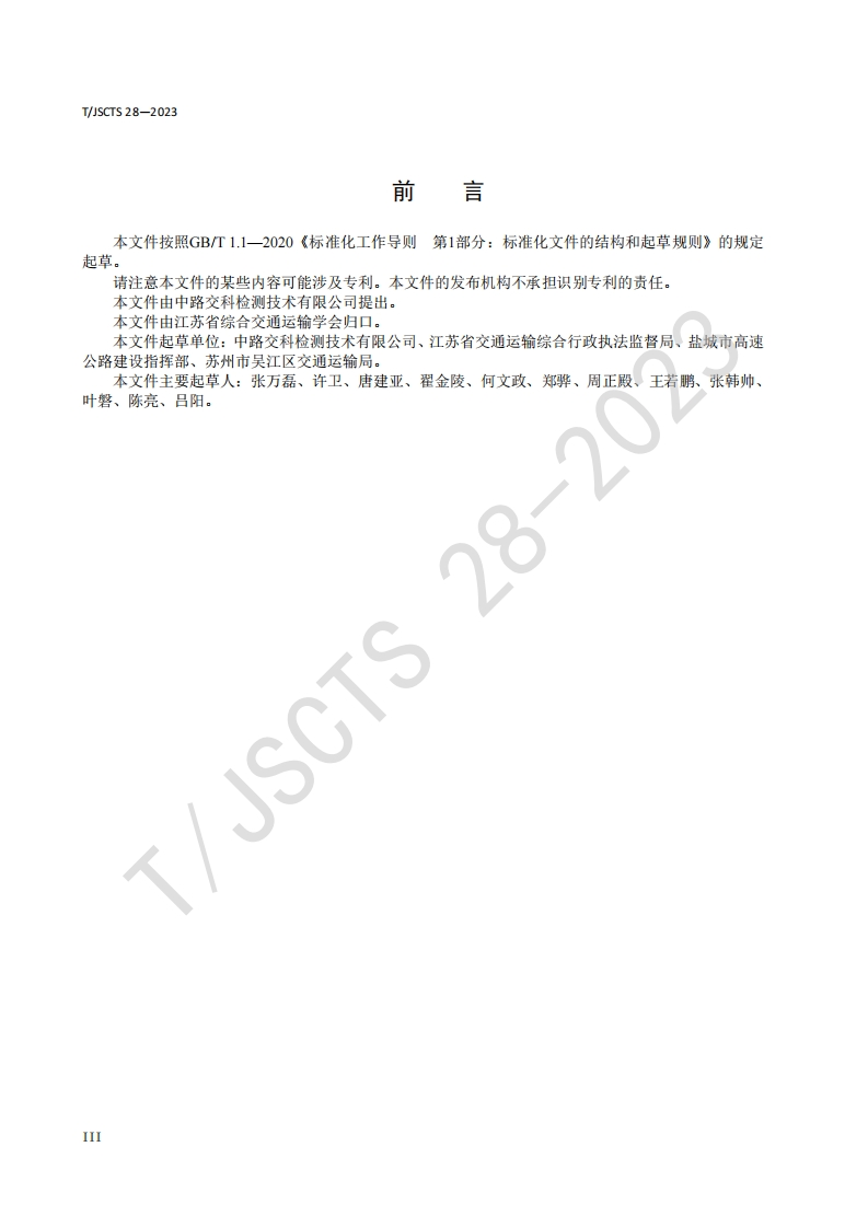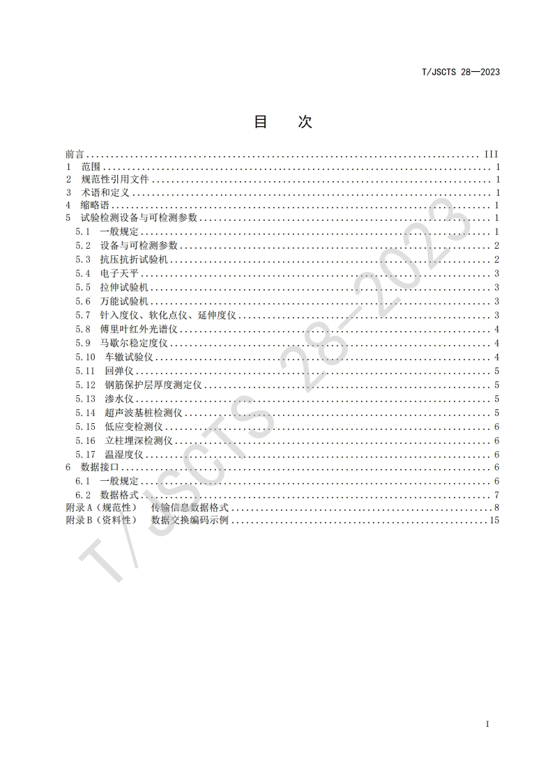 知信息数据交换技术公路工程试验检测见范Technicalspecificationfordataexchangeofperceptioninformationinhighwayengineeringtestanddetection348072@abc23小时前发布关注私信0.53MB21页049知信息数据交换技术公路工程试验检测见范Technicalspecificationfordataexchangeofperceptioninformationinhighwayengineeringtestanddetection此内容为付费资源,请付费后查看¥19¥23黄金会员免费钻石会员免费立即购买您当前未登录!建议登陆后购买,可保存购买订单付费资源 第1页 / 共21页 第2页 / 共21页 第3页 / 共21页 第4页 / 共21页 第5页 / 共21页 试读已结束,还剩16页,您可下载完整版后进行离线阅读 THE END标准规范 文本预览 ICS19.020CCS R 04团体标准T/JSCTS 28-2023公路工程试验检测感知信息数据交换技术规范。Technical specification for data exchange of perception information in highwayengineering test and detectionT/JSCT2023-3-20发布2023-5-1实施江苏省综合交通运输学会发布 查看更多 收起部分 喜欢就支持一下吧收藏