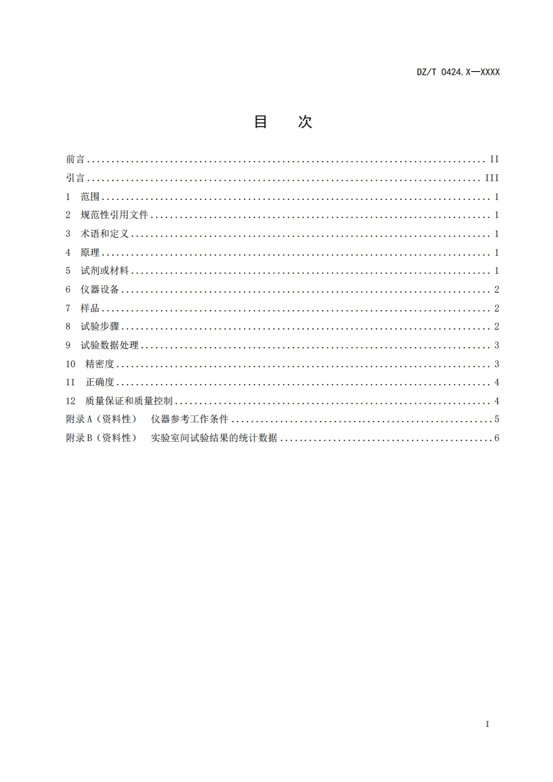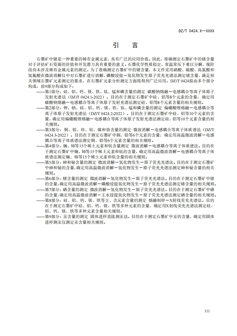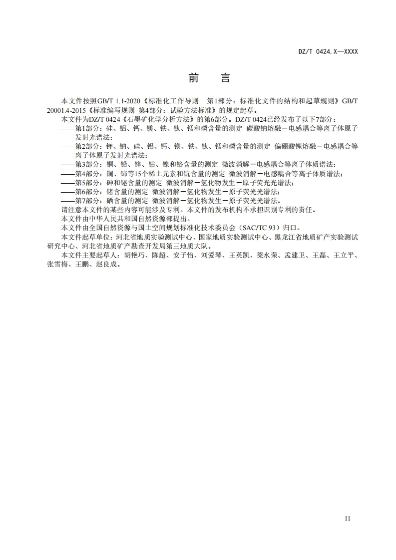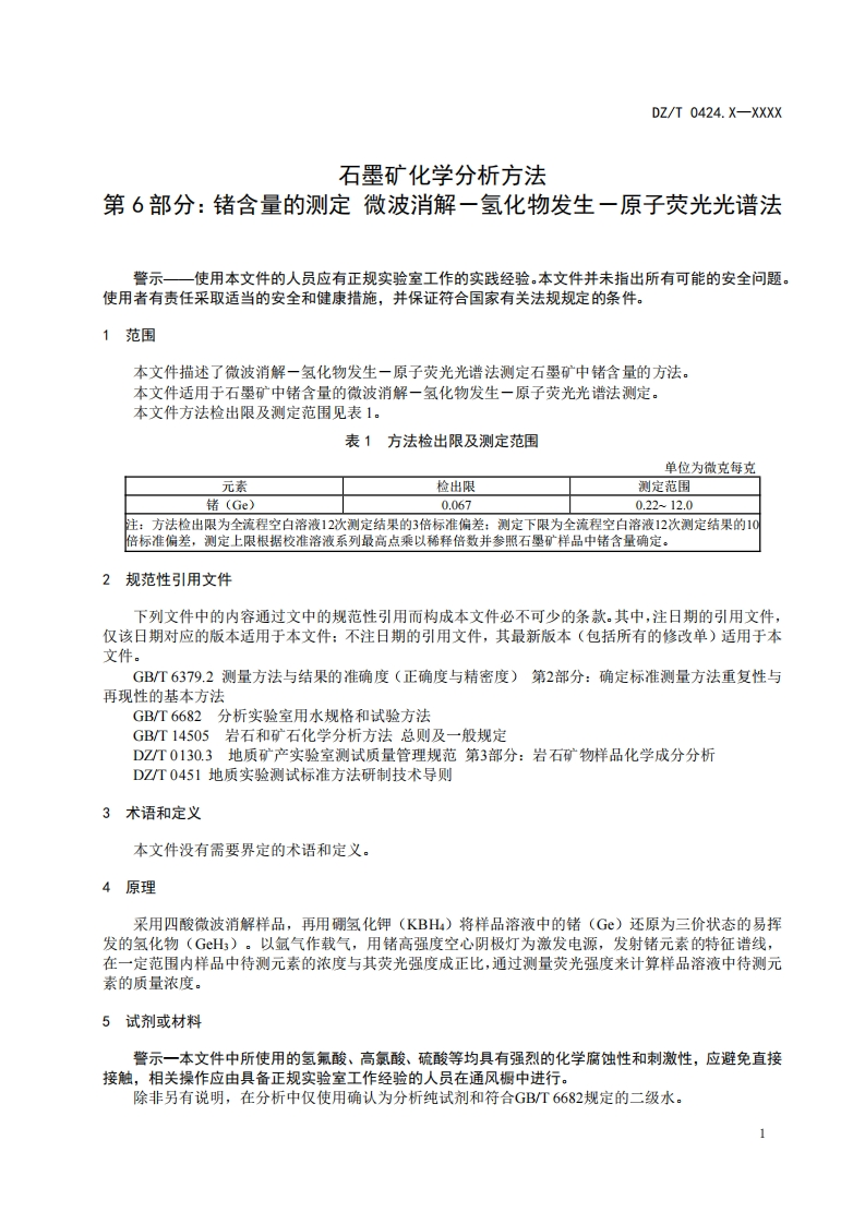 ICS73.080CCS D50/59DZ中华人民共和国地质矿产行业标准DZ/T 0424.X-XXXX石墨矿化学分析方法第6部分:锗含量的测定微波消解-氢化物发生一原子荧光光谱法Methods for chemical analysis of graphite ores-Part 6:Determination of germaniumcontent Microwave digestion-hydride generation-atomic fluorescence spectrometry(点击此处添加与国际标准一致性程度的标识)(报批稿)(完成时间:2025年8月26日)在提交反债意见时,请将您知道的相关专利连同支持性文件一并附上。XXXX-XX-XX发布XXXX-Xx-XX实施中华人民共和国自然资源部发布