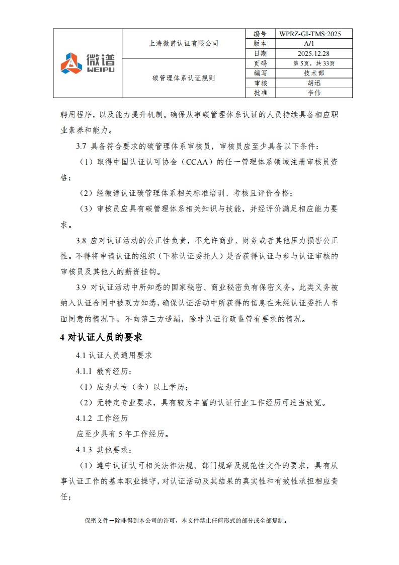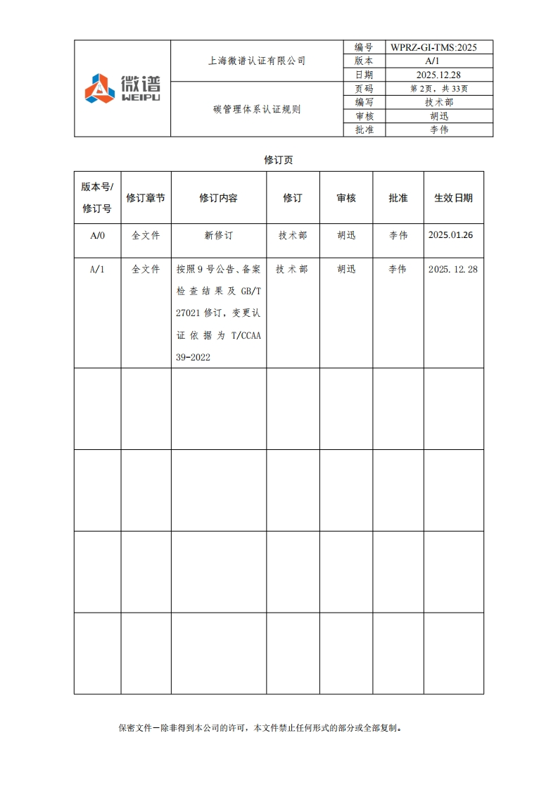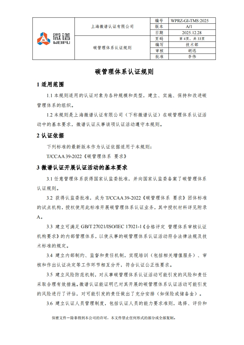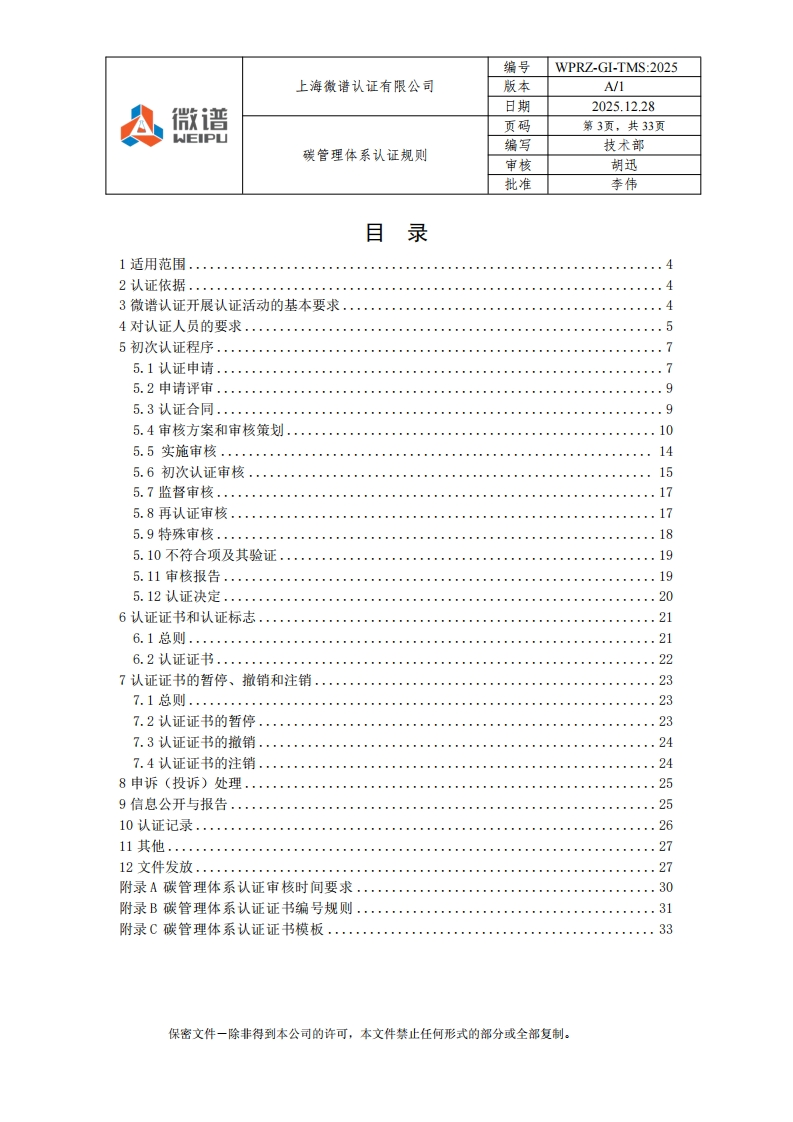 编号WPRZ-GI-TMS:2025上海微谱认证有限公司版本A/1微谱日期2025.12.28A页码第1页,共33页WEIPU编写碳管理体系认证规则技术部审核胡迅批准李伟碳管理体系认证规则文件编号:WPRZ-GL-TMS:2025版本号:A/1编写人:技术部审核人:2批准人:本南批准日期:2025-12-28注:本规则自批准之日起生效:本规则附录可以单独修订和发布。保密文件一除非得到本公司的许可,本文件禁止任何形式的部分或全部复制。