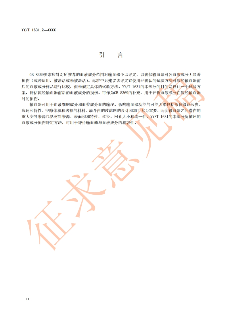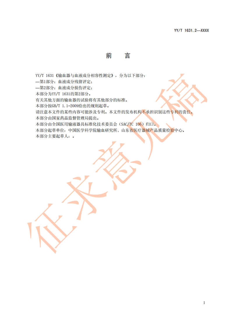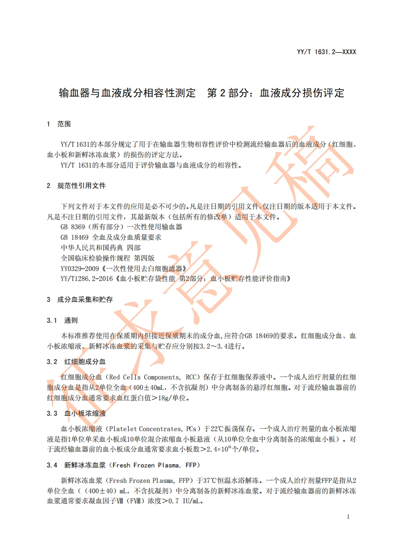 1CS11.040.01C30中华人民共和国医药行业标准YY/T 1631.2-XXXX输血器与血液成分相容性测定第2部分:血液成分损伤评定The compatibility determination of the transfusion sets with blood component Part2:Assessment of damage to blood components(征求意见稿)(本稿完成日期:2019-7-14)在提交反馈意见时,请将你所知道的相关专利连同支持性文件一并附上。-Xx-XX发布XXXX-Xx-X实施国家药品监督管理局发布