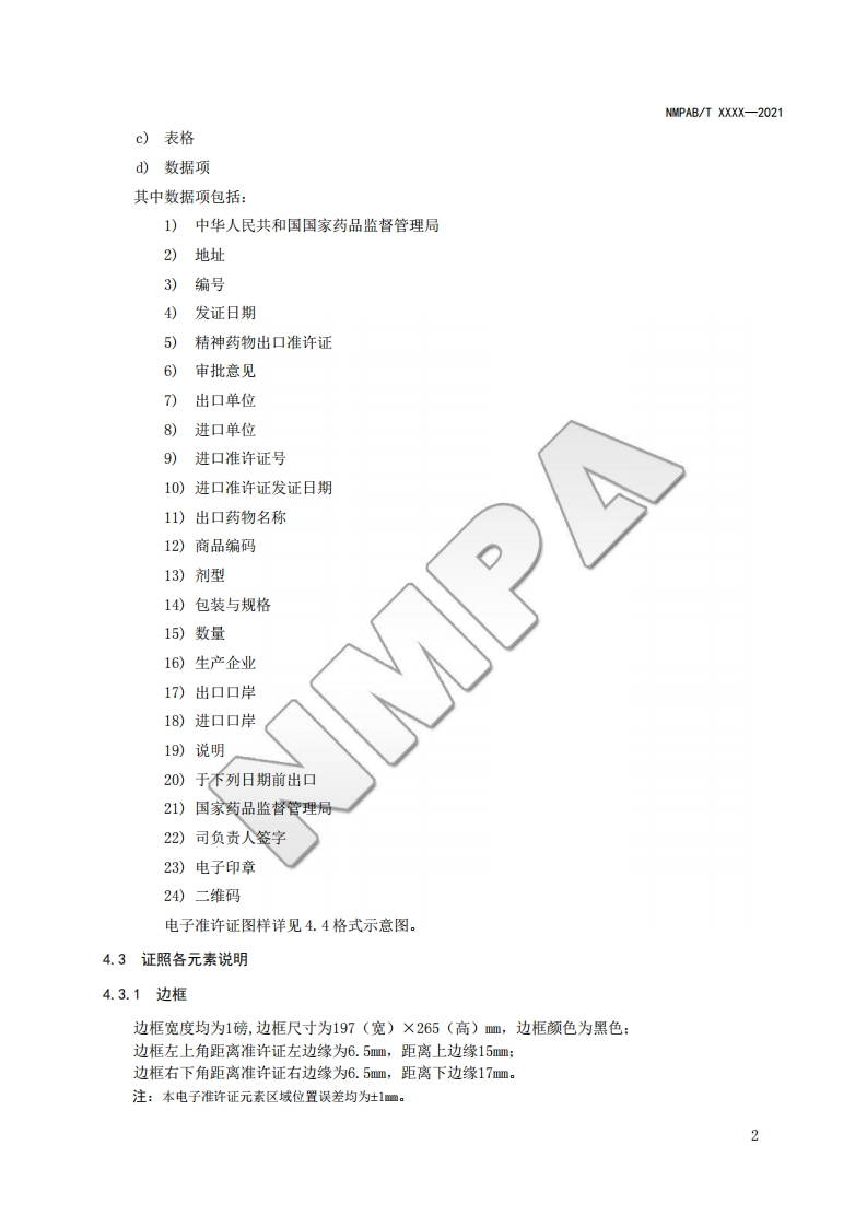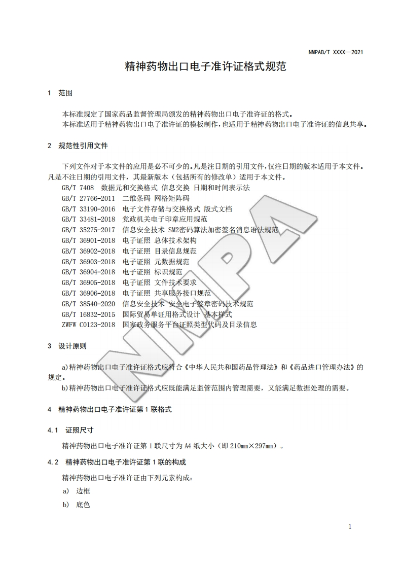 精神药物出口电子准许证格式Formsforelectroniccertificateofpsychotropicsubstancesexportauthorization书意毡348072@abc前天发布关注私信2.72MB25页045精神药物出口电子准许证格式Formsforelectroniccertificateofpsychotropicsubstancesexportauthorization书意毡此内容为付费资源,请付费后查看¥19¥23黄金会员免费钻石会员免费立即购买您当前未登录!建议登陆后购买,可保存购买订单付费资源 第1页 / 共25页 第2页 / 共25页 第3页 / 共25页 第4页 / 共25页 第5页 / 共25页 试读已结束,还剩20页,您可下载完整版后进行离线阅读 THE END标准规范 文本预览 NMPAB国家药品监督管理局信息化标准NMPAB/T xxxx-2021精神药物出口电子准许证格式Forms for electronic certificate of psychotropic substances export authorization(征求意见稿)2021-XX-XX发布2021-XX-XX实施国家药品监督管理局发布 查看更多 收起部分 喜欢就支持一下吧收藏