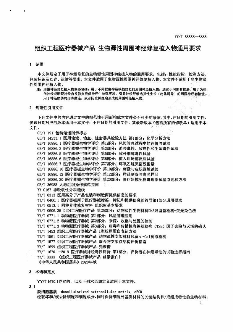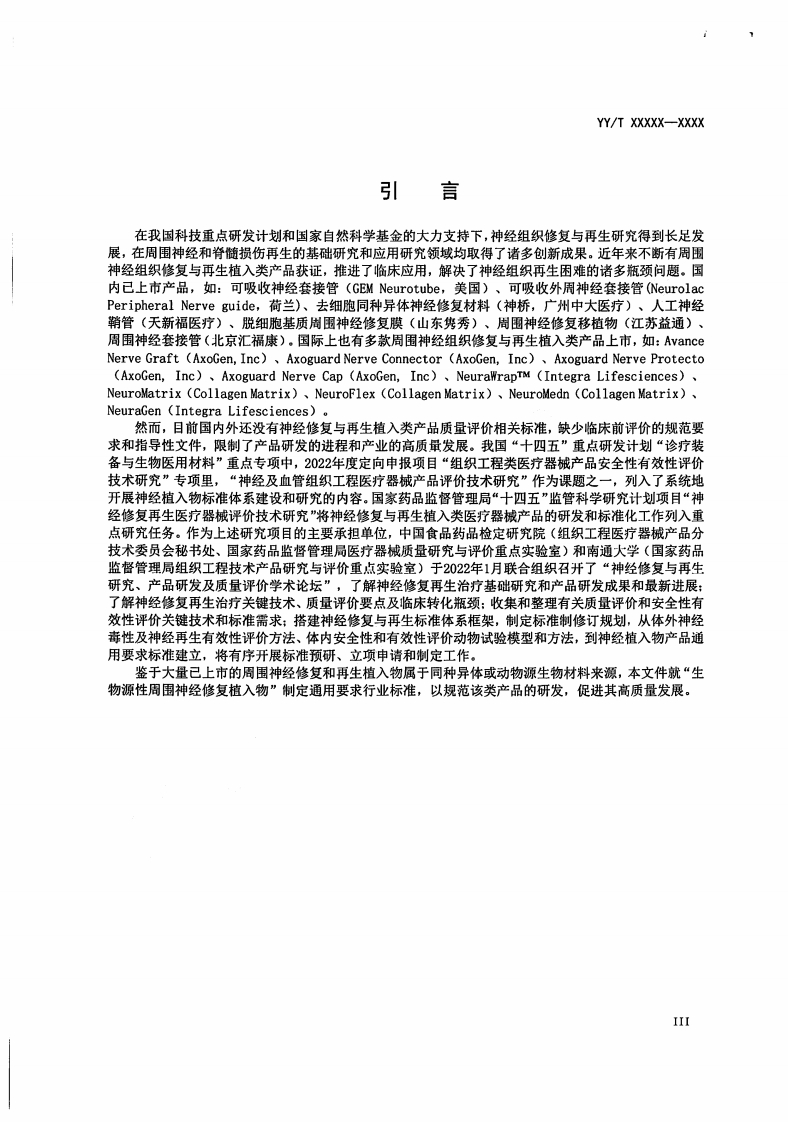 1CS11.040.40CCS 45YY中华人民共和国医药行业标准YY/T XXXXX-XXXX组织工程医疗器械产品生物源性周围神经修复植入物通用要求Tissue engineering medical device products-Generic requirement for bio-derivedperipheral nerve repair implant征求意见稿(2022年7月)在提交反馈意见时,请将您知道的相关专利连同支持性文件一并附上。建议标准发布12个月后开始实施XXXX-XX-XX发布XXXX-X-XX实施国家药品监督管理局发布