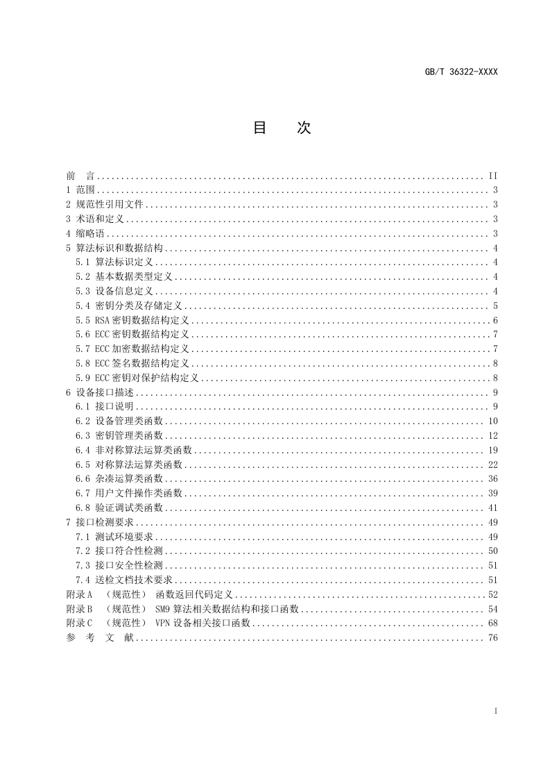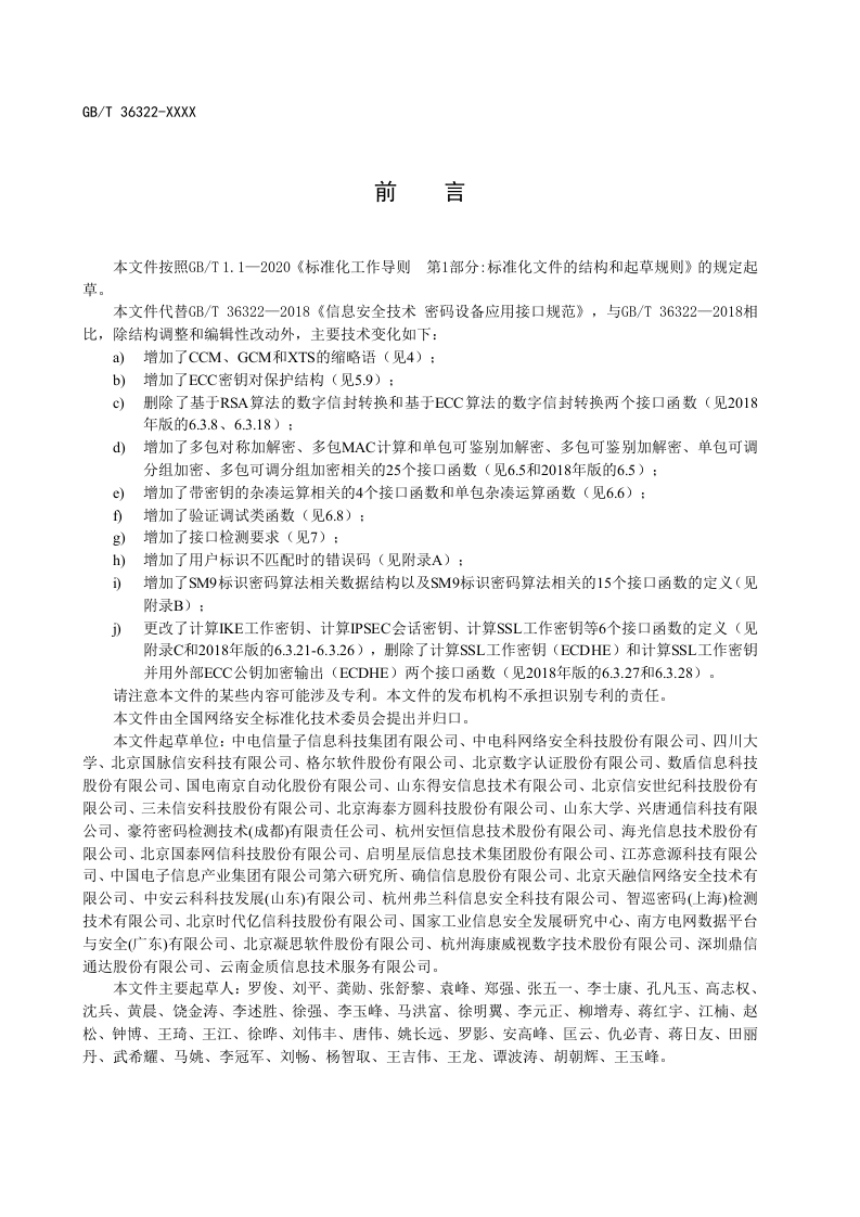 ICS35.030CCS L 80中华人民共和国国家标准GB/T 36322-XXXX代替GB/T36322-2018网络安全技术密码设备应用接口规范Cybersecurity techno logy-Cryptographic device application interface specification征求意见稿在提交反馈意见时,请将您知道的相关专利连同支持性文件一并附上。XXXX-XX-XX发布XXX-x-X实施国家中场监督管里总局发布同家标淮化件理委贞会1