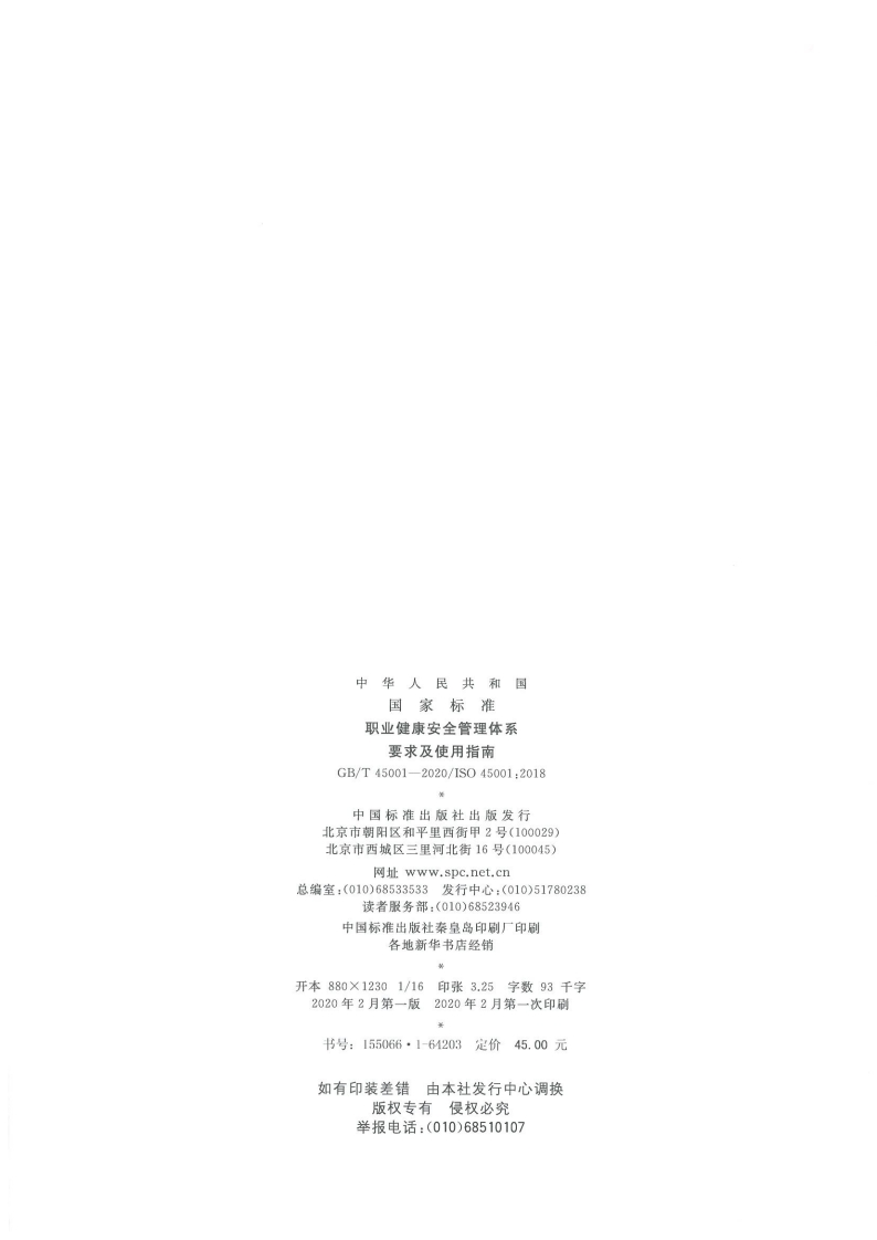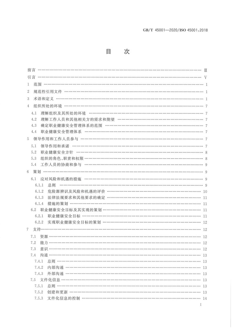 1CS13.100C78GB中华人民共和国国家标准GB/T45001-2020/IS045001:2018代替GB/T28001一2011,GB/T28002一2011职业健康安全管理体系要求及使用指南Occupational health and safety management systems-Requirements with guidance for use(ISO45001:2018,IDT)2020-03-06发布2020-03-06实施国家市场监督管理总局Φ发布国家标准化管理委员会余层查真份