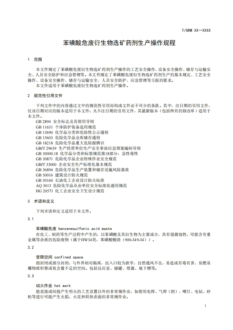 ICS73.040CCS B1110I/GRM中关村绿色矿山产业联盟团体标准T/GRM XX-XXXX苯磺酸危废衍生物选矿药剂复配与改性工艺技术要求Technical Requirements for the Formulation and Modification Process of MineralProcessing Reagents Derived from Benzene Sulfonic Acid Hazardous Waste(征求意见稿)XXXX-Xx-XX发布XXXX-Xx-XX实施中关村绿色矿山产业联盟发布