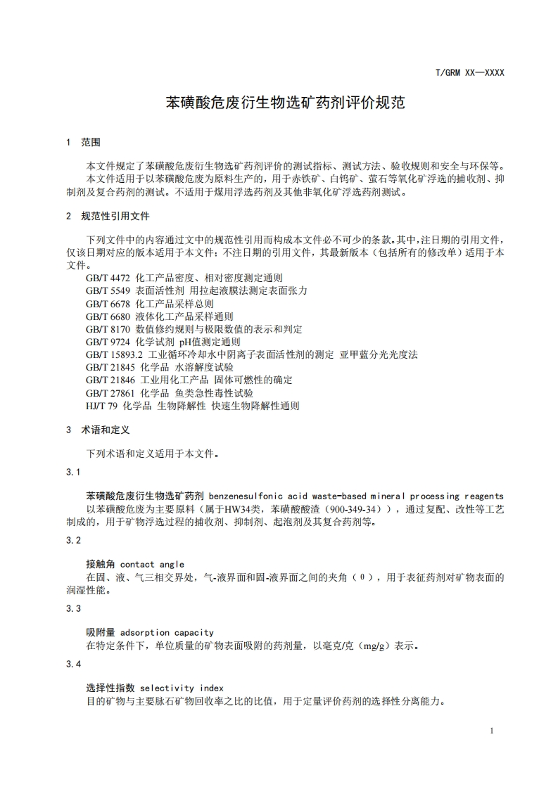 ICS73.040CCS B1110I/GRM中关村绿色矿山产业联盟团体标准T/GRM XX-XXXX苯磺酸危废衍生物选矿药剂评价规范Evaluation Specification for Mineral Processing Reagents Derived from BenzeneSulfonic Acid Hazardous Waste Derivatives(征求意见稿)XXXX-Xx-XX发布XXXX-Xx-XX实施中关村绿色矿山产业联盟发布