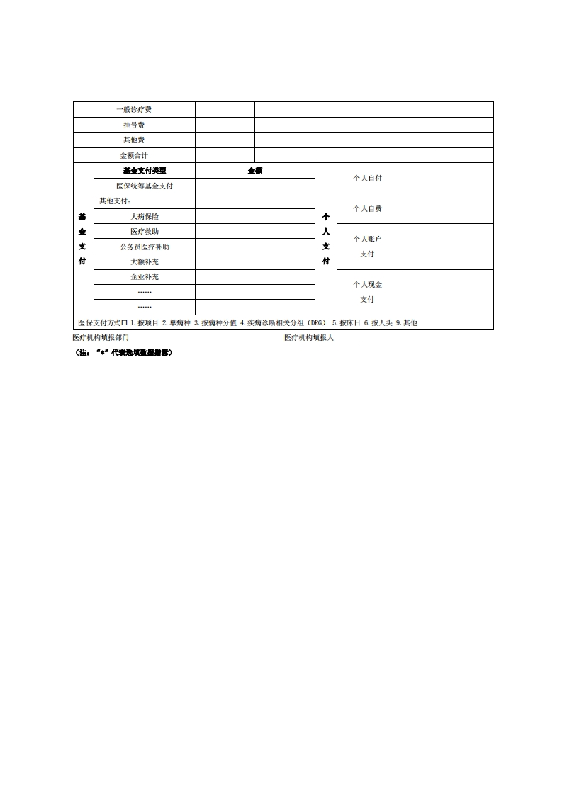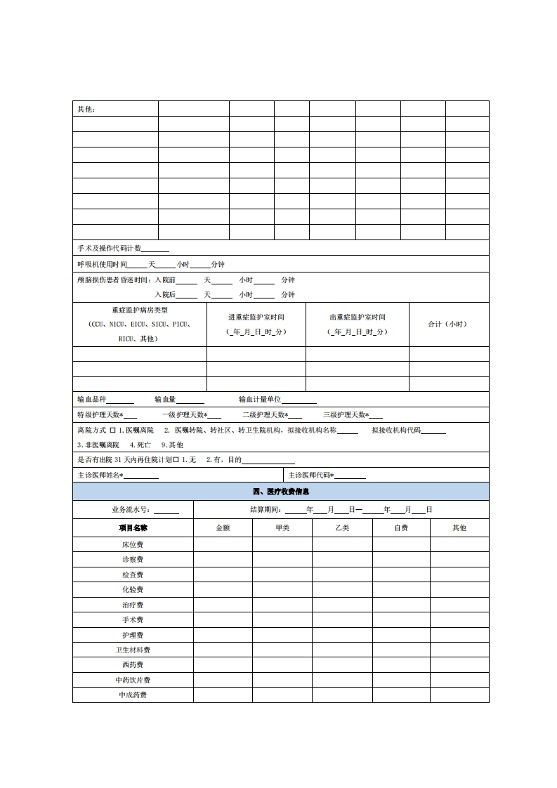 医疗保障基金结算清单定点医疗机构名称定点医疗机构代码医保结算等级医保编号病案号」申报时间年月日一、基本信意姓名性别▣1.男2.女出生日期年_月_日年龄岁国籍(年龄不足1周岁)年龄天民族患者证件类别患者证件号码职业现住址省(区、市)市县工作单位名称工作单位地址单位电话邮编联系人姓名关系地址省(区、市)市县电话医保类型特殊人员类型参保地」新生儿入院类型新生儿出生体重克新生儿入院体重克二、门诊慢特清诊疗信惠诊断科别就诊日期诊断名称诊断代码手术及操作名称手术及操作代码三、生洗诊疗信意住院医疗类型口1.住院2.日间手术入院途径口1.急诊2.门诊3.其他医疗机构转入9.其他治疗类别口1.西医2.中医(2.1中医2.2民族医)3.中西医入院时间年月日时入院科别转科科别出院时间年月日时出院科别实际住院天门(急)诊诊断(西医诊断)疾病代码门(急)诊诊断(中医诊断)疾病代码」出院西医诊断疾病代码入院病情出院中医诊断疾病代码入院病情主要诊断:主病:其他诊断:主证:诊断代码计数手术及操麻醉术者医师术者医师麻醉医师麻醉医师手术及操作名称手术及操作代码作日期方式*姓名代码姓名代码主要