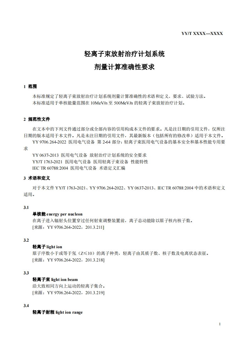 1CS11.040.60C43中华人民共和国医药行业标YY/TXXXX-XXXX轻离子束放射治疗计划系统剂量计算准确性要求Requirement for radiotherapy treatment planning system accuracy of dosimetriccaculation for light ion beam(征求意见稿)本稿完成日期:2022-07-24XXXX-XX-XX发布XXXX-XX-XX实施国家药品监督管理局发布