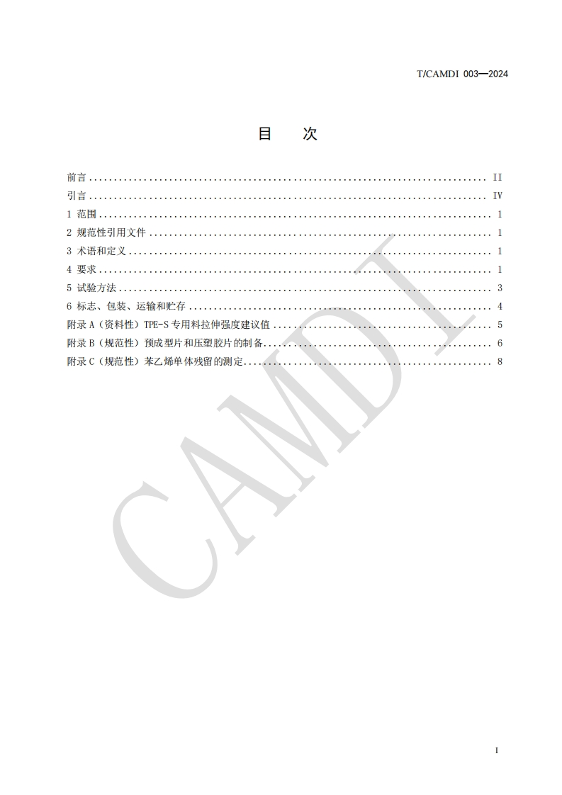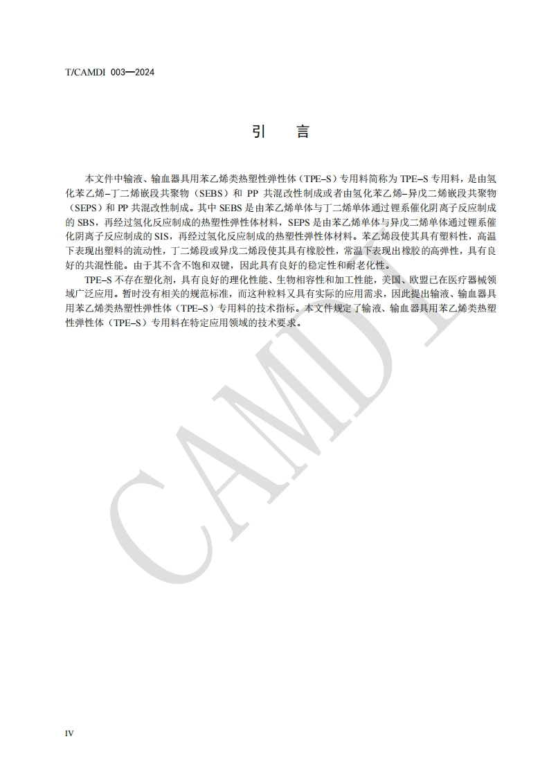 ICS11.040.20CCS C31中国医疗器械行业协会China Association for Medical Devices Industry团体标准T/CAMDI003-2024代替T/CAMDI003-2016输液、输血器具用苯乙烯类热塑性弹性体(TPE-S)专用料Styrenic-based thermoplastic elastomer(TPE-S)compounds for infusion andtransfusion equipment for medical use2024-12-31发布2025-1-3实施中国医疗器械行业协会发布