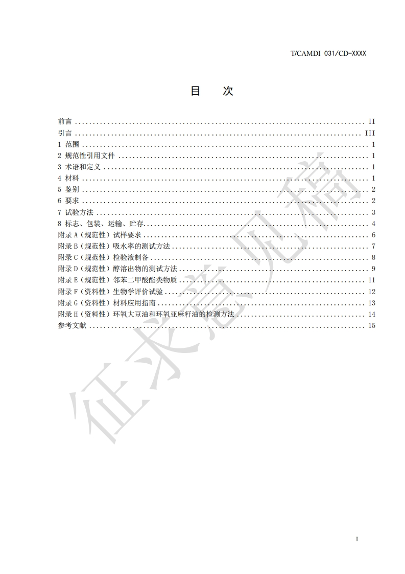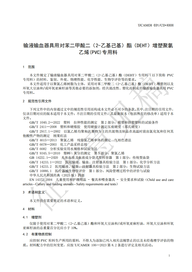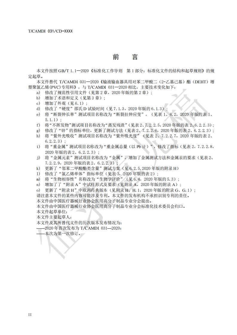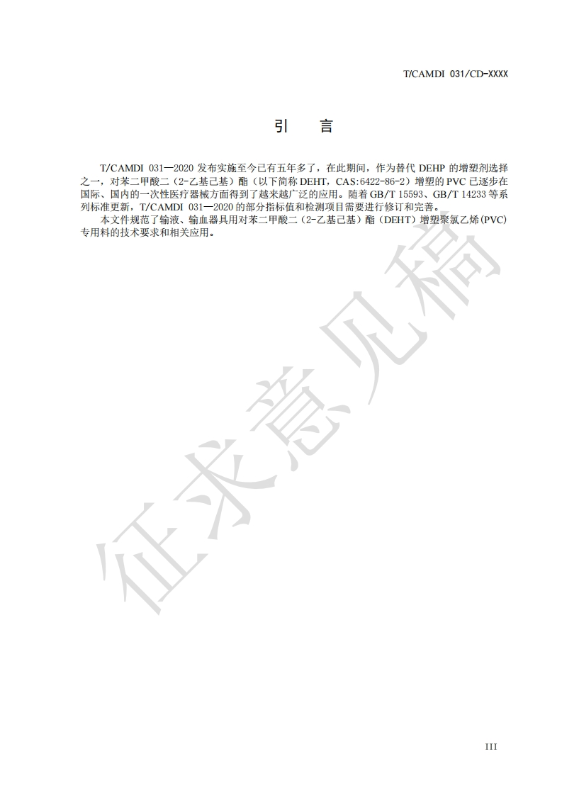 ICS11.040.20CCS C31中国医疗器械行业协会China Association for Medical Devices Industry团体标准T/CAMDI031/CD一××XX代替T/CAMDI031-2020输液输血器具用对苯二甲酸二(2-乙基己基)酯(DEHT)增塑聚氯乙烯(PVC)专用料Di-(2-ethylhexyl)terephthalate(DEHT)plasticized polyvinyl chloride(PVC)compounds for infusion and transfusion equipments(征求意见稿CD)在提交反馈意见时,请将您知道的相关专利连同支持性文件一并附上。××X×-X×-××发布××××-××-××实施中国医疗器械行业协会发布