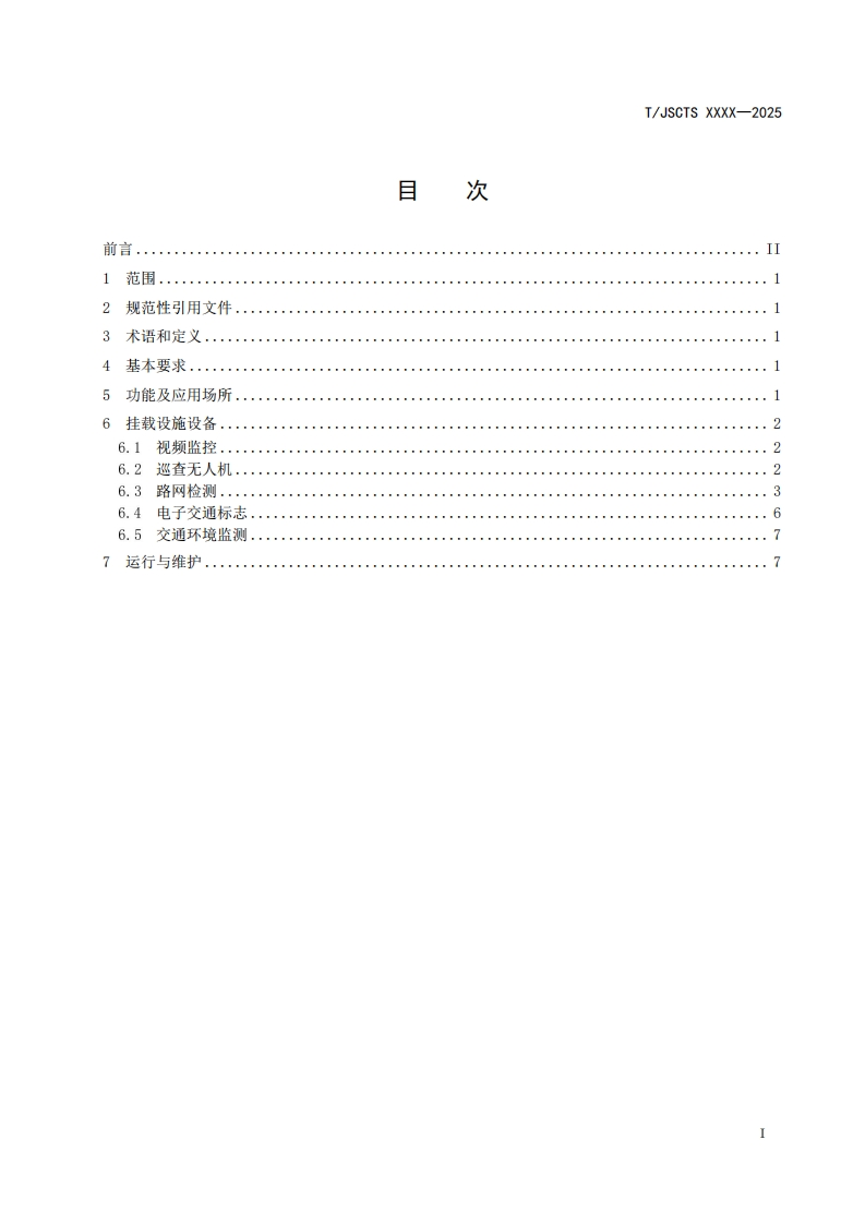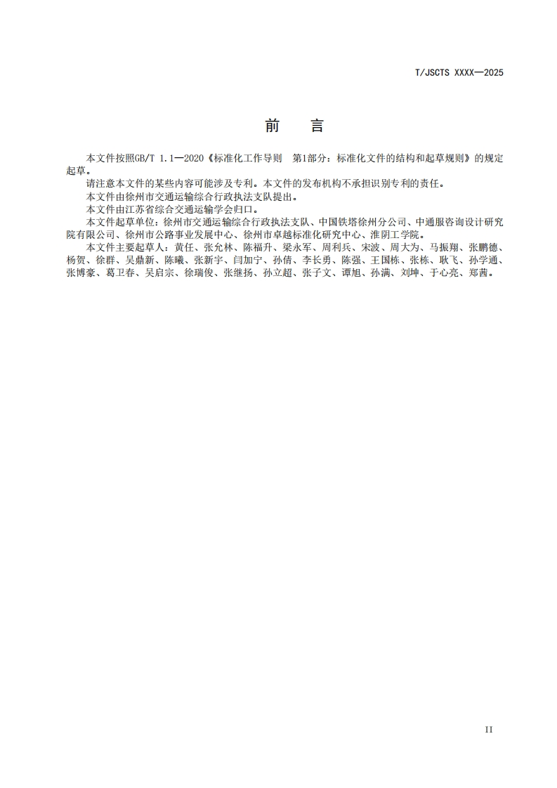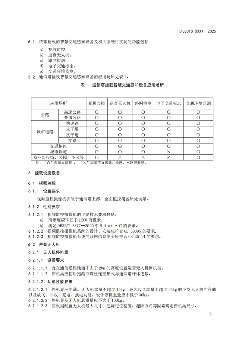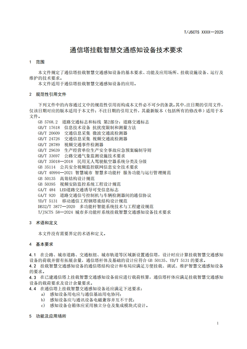 ICS25.040CCS L 70T/JSCTS江苏省综合交通运输学会团体标准T/JSCTS XXXX-2025通信塔挂载智慧交通感知设备技术要求Technical requirements for mounting smart traffic sensing devices ontelecommunication tower(征求意见稿)在提交反债意见时,请将您知道的相关专利连同支持性文件一并附上。XXXx-x-XX发布XXXX-x-XX实施江苏省综合交通运输学会,发布