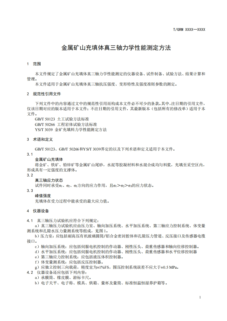 ICS点击此处添加ICS号CCS点击此处添加CCS号0/LB.▣XXXXX-XXXxIGRM中关村绿色矿山产业联盟团体标准T/GRM XXXX-XXXX金属矿山充填体真三轴力学性能测定方法Determination Method of True Triaxial Mechanical Properties of Metal MineBackfill(征求意见稿)XXXX-X-XX发布XXXX-XX-XX实施中关村绿色矿山产业联盟发布