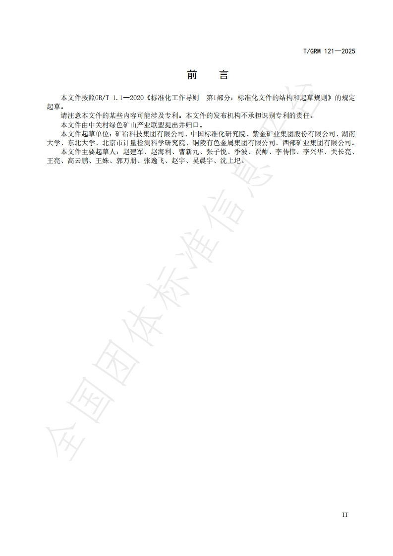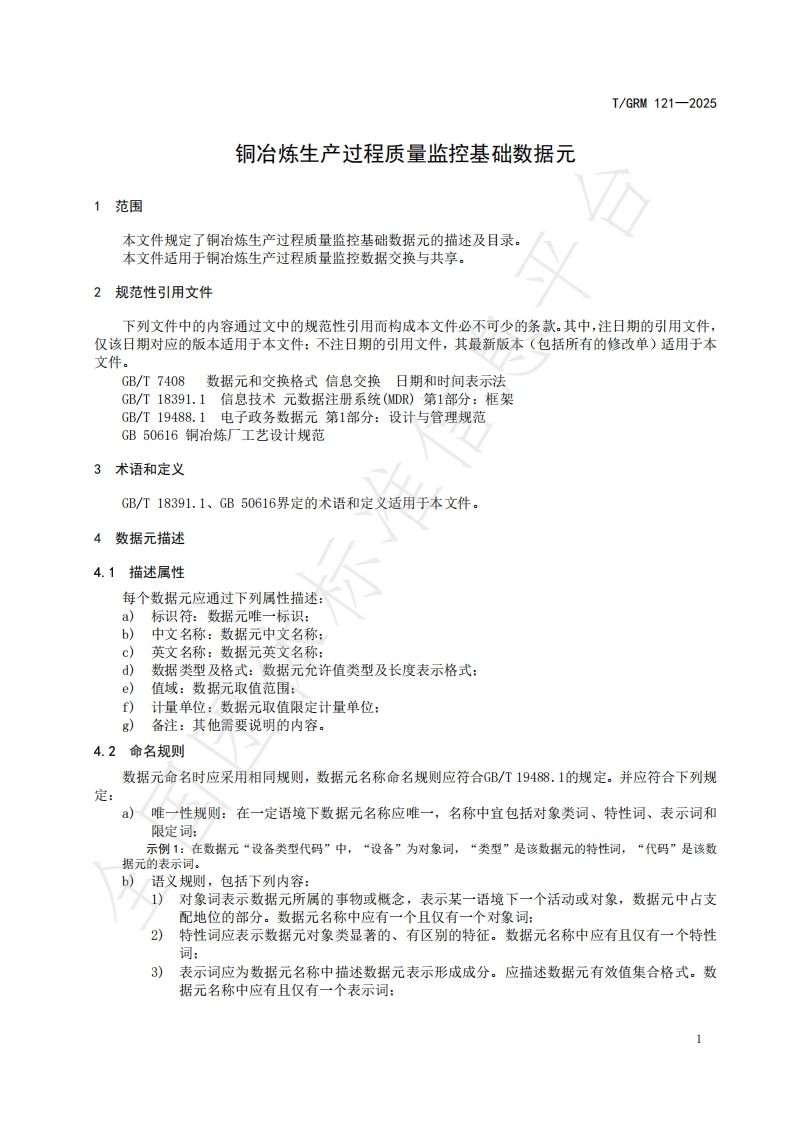 铜冶炼生产过程质量监控基础数据元Basicdataelementofcoppersmeltingproductionprocessqualitycontrol348072@abc21天前发布关注私信0.76MB38页038铜冶炼生产过程质量监控基础数据元Basicdataelementofcoppersmeltingproductionprocessqualitycontrol此内容为付费资源,请付费后查看¥19¥23黄金会员免费钻石会员免费立即购买您当前未登录!建议登陆后购买,可保存购买订单付费资源 第1页 / 共38页 第2页 / 共38页 第3页 / 共38页 第4页 / 共38页 第5页 / 共38页 试读已结束,还剩33页,您可下载完整版后进行离线阅读 THE END标准规范 文本预览 ICS77.120.01CCS H 04TGRM中关村绿色矿山产业联盟团体标准T/GRM121-2025铜冶炼生产过程质量监控基础数据元Basic data element of copper smelting production process quality control国团体2025-04-23发布2025-04-24实施中关村绿色矿山产业联盟发布 查看更多 收起部分 喜欢就支持一下吧收藏