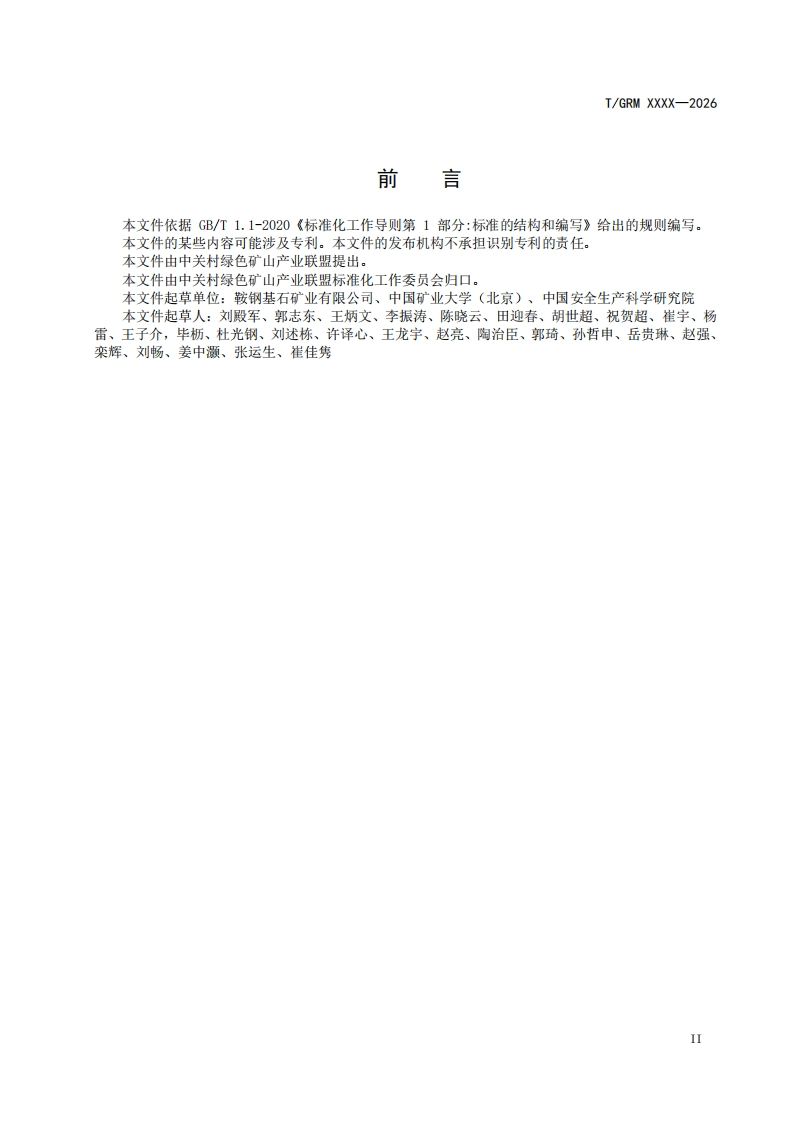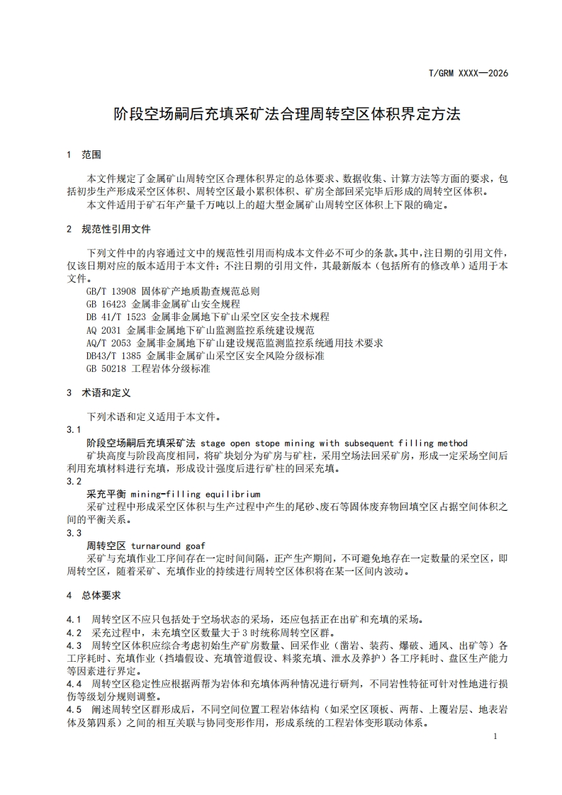 ICS点击此处添加ICS号CCS点击此处添加CCS号IGRM中关村绿色矿山产业联盟团体标准T/GRM XXXX-2026阶段空场嗣后充填采矿法合理周转空区体积界定方法Determination of reasonable volume of turnover goafs for the stage empty fieldsubsequent filling mining method(工作组讨论稿)XXXx-x-XX发布XXXX-x-XX实施中关村绿色矿山产业联盟发布发布