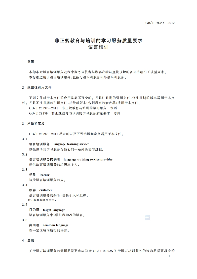 1Cs03.080A12中华人民共和国国家标准GB/T29357一2012@非正规教育与培训的学习服务质量要求语言培训Quality requirements of learning services for non-formal educationand training-Language training2012-12-31发布2013-05-01实施中华人民共和国国家质量监督检验检疫总局发布中国国家标准化管理委员会