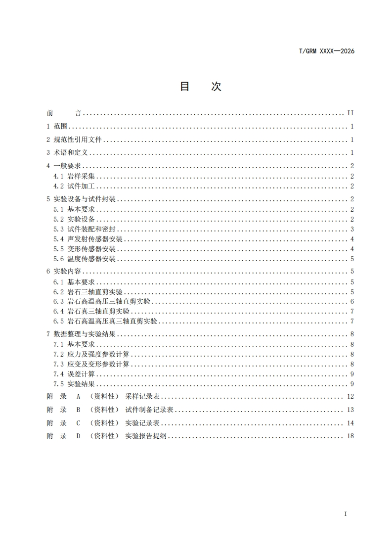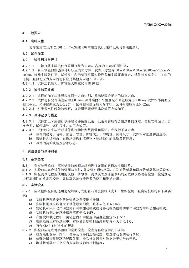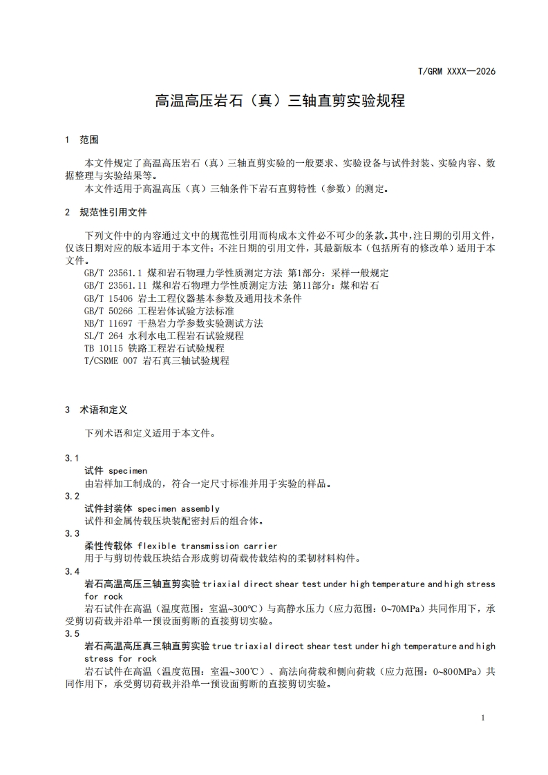 ICS点击此处添加ICS号CCS点击此处添加CCs号T/GRM中关村矿山产业联盟团体标准T/GRM XXXX-2026高温高压岩石(真)三轴直剪实验规程Technical specification for(true)triaxial direct shear test under high-temperature andhigh stress of rock specimen(征求意见稿)XXXX-Xx-XX发布XXXX-Xx-XX实施中关村绿色矿山产业联盟发布