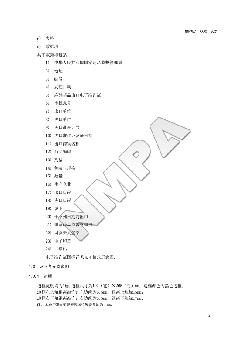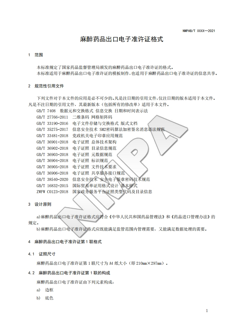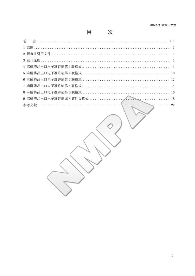 麻醉药品出口电子准许证格式Formsforelectroniccertificateofnarcoticdrugsexportauthorization心产毡_348072@abc22天前发布关注私信2.70MB25页022麻醉药品出口电子准许证格式Formsforelectroniccertificateofnarcoticdrugsexportauthorization心产毡_此内容为付费资源,请付费后查看¥19¥23黄金会员免费钻石会员免费立即购买您当前未登录!建议登陆后购买,可保存购买订单付费资源 第1页 / 共25页 第2页 / 共25页 第3页 / 共25页 第4页 / 共25页 第5页 / 共25页 试读已结束,还剩20页,您可下载完整版后进行离线阅读 THE END标准规范 文本预览 NMPAB国家药品监督管理局信息化标准NMPAB/T xxxx-2021麻醉药品出口电子准许证格式Forms for electronic certificate of narcotic drugs export authorization(征求意见稿)2021-Xx-XX发布2021-XX-XX实施国家药品监督管理局发布 查看更多 收起部分 喜欢就支持一下吧收藏