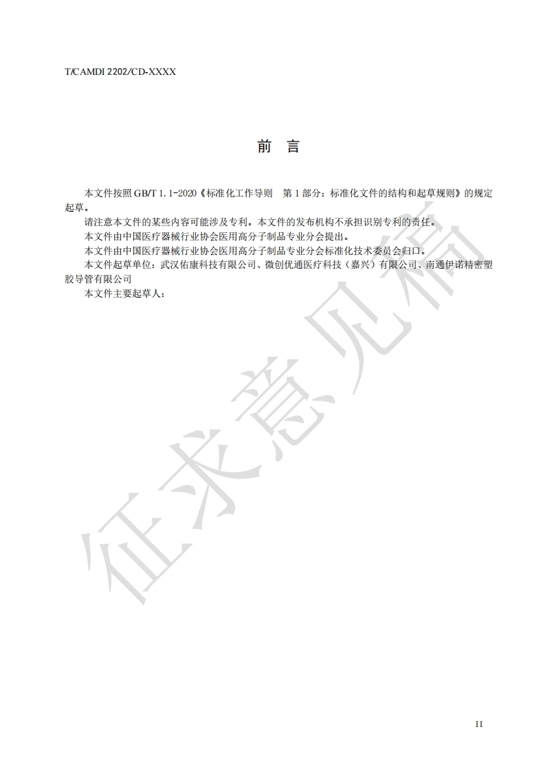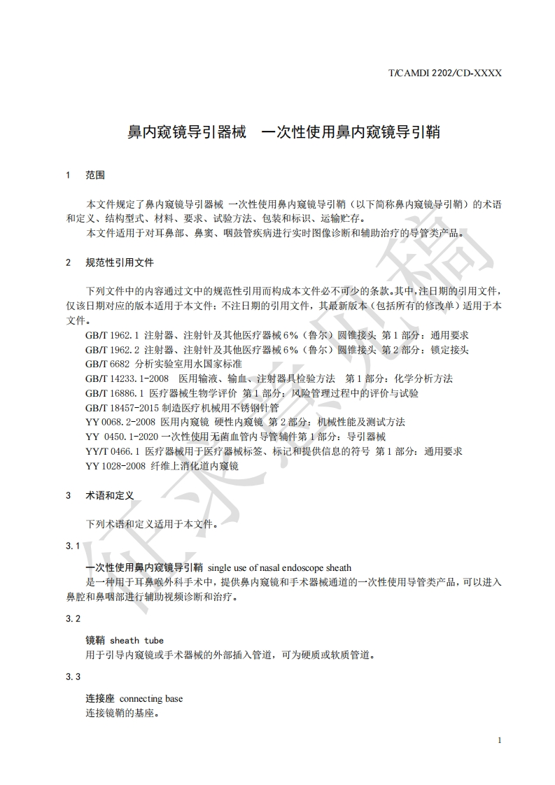 ICS11.040.30CCS C 30中国医疗器械行业协会China Association for Medical Devices Industry团体标准T/CAMDI 2202/CD-XXXX鼻内窥镜导引器械一次性使用鼻内窥镜导引鞘Nasal endoscope guiding device Single use of Nasal Endoscope Sheath(征求意见稿CD)在提交反馈意见时,请将您知道的相关专利连同支持性文件一并附上。2021-××-××发布2021-××-××实施中国医疗器械行业协会发布