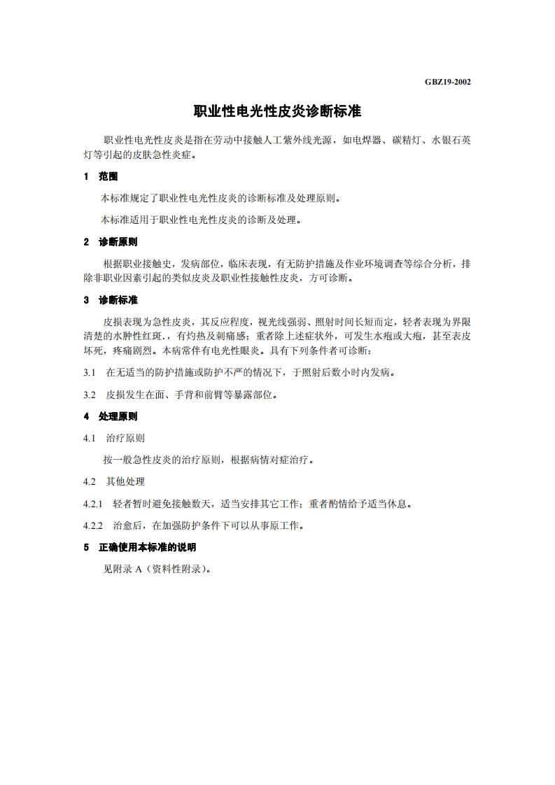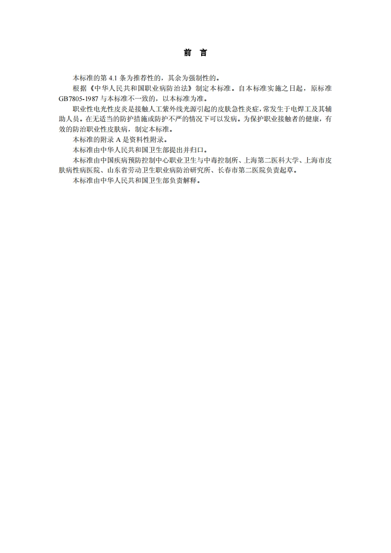 11、1职业性电光性皮炎诊断标准DiagnosticCriteriaofOccupationalElectroflashDermatitis348072@abc22天前发布关注私信98.16KB4页04611、1职业性电光性皮炎诊断标准DiagnosticCriteriaofOccupationalElectroflashDermatitis此内容为付费资源,请付费后查看¥13¥19黄金会员免费钻石会员免费立即购买您当前未登录!建议登陆后购买,可保存购买订单付费资源 第1页 / 共4页 第2页 / 共4页 第3页 / 共4页 第4页 / 共4页 已完成全部阅读,共4页 THE END标准规范 文本预览 1CS13.100C60GBZ中华人民共和国国家职业卫生标准GBZ19-2002职业性电光性皮炎诊断标准Diagnostic Criteria of Occupational Electroflash Dermatitis2002-04-08发布2002-06-01实施中华人民共和国卫生部发布 查看更多 收起部分 喜欢就支持一下吧收藏