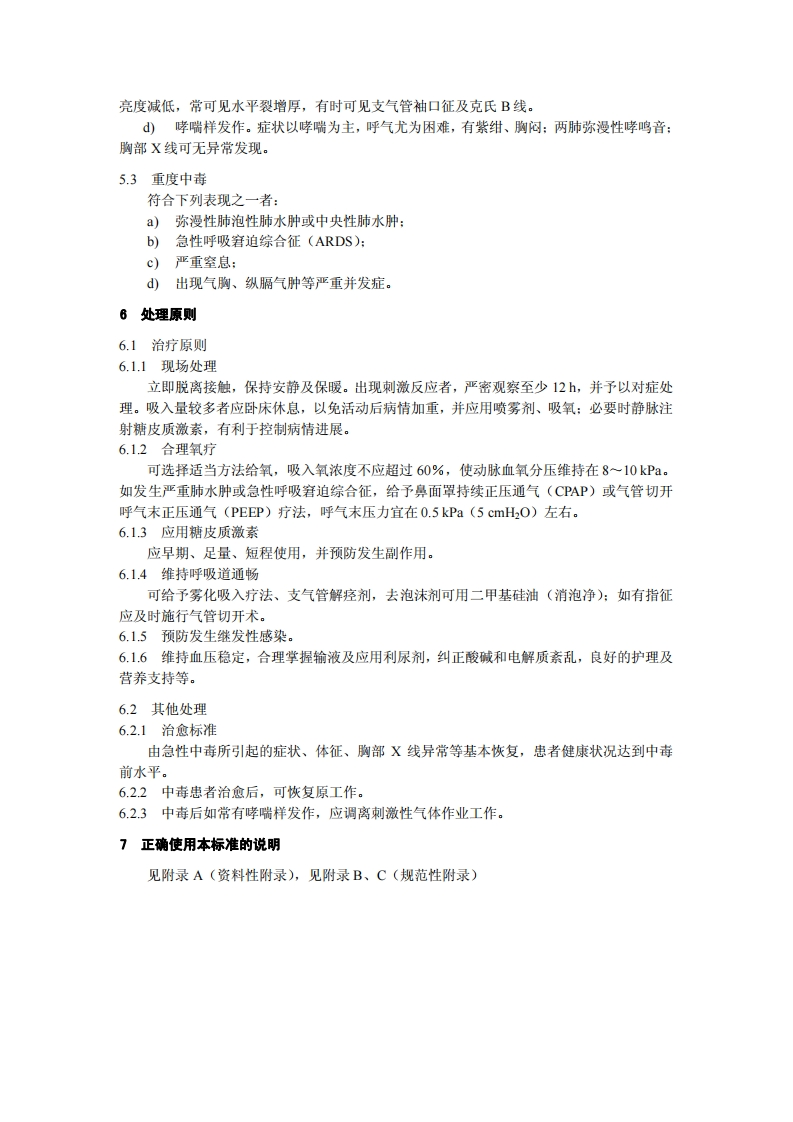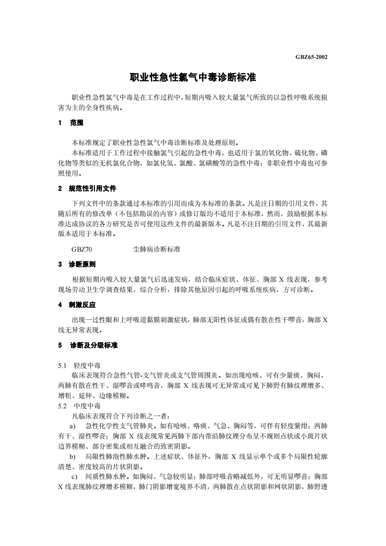 1、1、1职业性急性氯气中毒诊断标准DiagnosticCriteriaofOccupationalAcuteChlorinePoisoning348072@abc22天前发布关注私信0.17MB7页0411、1、1职业性急性氯气中毒诊断标准DiagnosticCriteriaofOccupationalAcuteChlorinePoisoning此内容为付费资源,请付费后查看¥13¥19黄金会员免费钻石会员免费立即购买您当前未登录!建议登陆后购买,可保存购买订单付费资源 第1页 / 共7页 第2页 / 共7页 第3页 / 共7页 第4页 / 共7页 第5页 / 共7页 试读已结束,还剩2页,您可下载完整版后进行离线阅读 THE END标准规范 文本预览 1CS13.100C60GBZ中华人民共和国国家职业卫生标准GBZ65-2002职业性急性氯气中毒诊断标准Diagnostic Criteria of Occupational Acute Chlorine Poisoning2002-04-08发布2002-06-01实施中华人民共和国卫生部发布 查看更多 收起部分 喜欢就支持一下吧收藏
