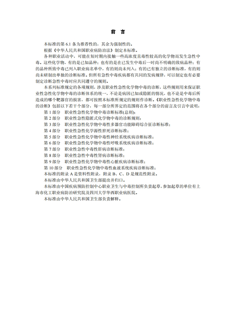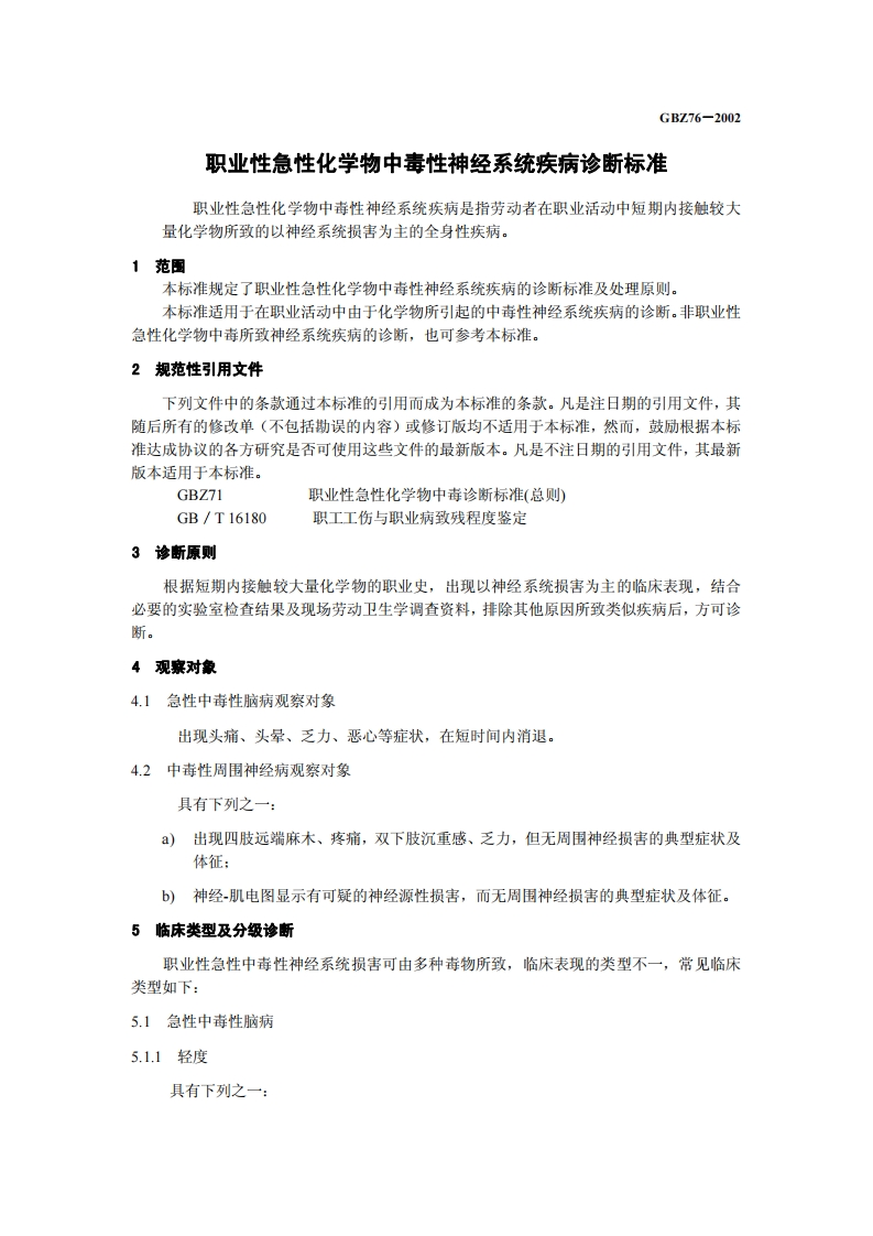 GBZ76-2002职业性急性化学物中毒性神经系统疾病诊断标准DiagnosticCriteriaofOccupationalAcuteNeurotoxicDiseasesCausedbyChemicals348072@abc22天前发布关注私信0.27MB16页035GBZ76-2002职业性急性化学物中毒性神经系统疾病诊断标准DiagnosticCriteriaofOccupationalAcuteNeurotoxicDiseasesCausedbyChemicals此内容为付费资源,请付费后查看¥13¥19黄金会员免费钻石会员免费立即购买您当前未登录!建议登陆后购买,可保存购买订单付费资源 第1页 / 共16页 第2页 / 共16页 第3页 / 共16页 第4页 / 共16页 第5页 / 共16页 试读已结束,还剩11页,您可下载完整版后进行离线阅读 THE END标准规范 文本预览 ICS13.100C60GBZ中华人民共和国国家职业卫生标准GBZ76-2002职业性急性化学物中毒性神经系统疾病诊断标准Diagnostic Criteria of Occupational Acute Neurotoxic Diseases Caused by Chemicals2002-04-08发布2002-06-01实施中华人民共和国卫生部发布 查看更多 收起部分 喜欢就支持一下吧收藏