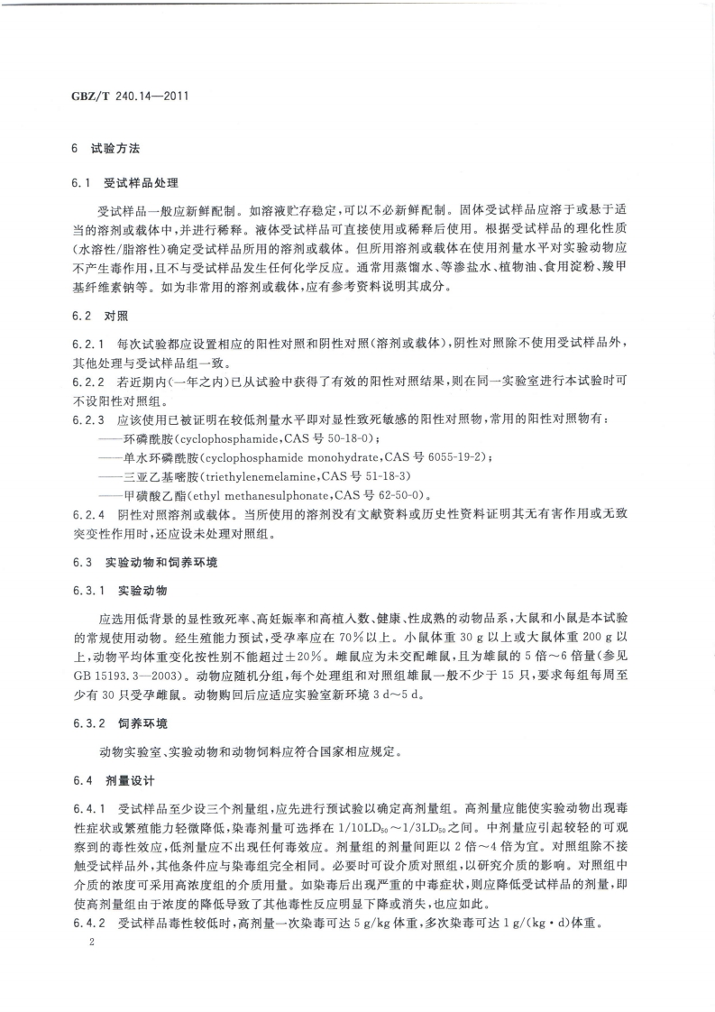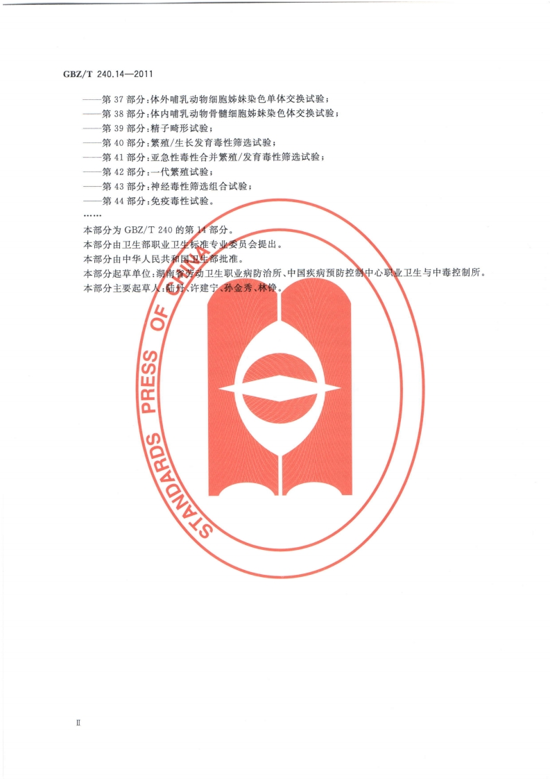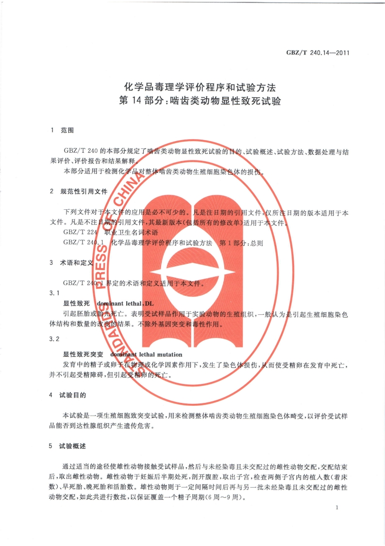 ICS13.100C52G8Z中华人民共和国国家职业卫生标准GBZ/T240.14-2011化学品毒理学评价程序和试验方法第14部分:啮齿类动物显性致死试验Procedures and tests for toxicological evaluations of chemicals-Part 14:Rodent dominant lethal test2011-08-19发布2012-03-01实施数防伪中华人民共和国卫生部发布