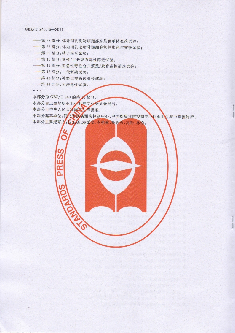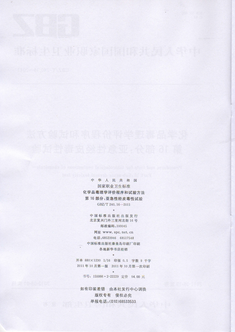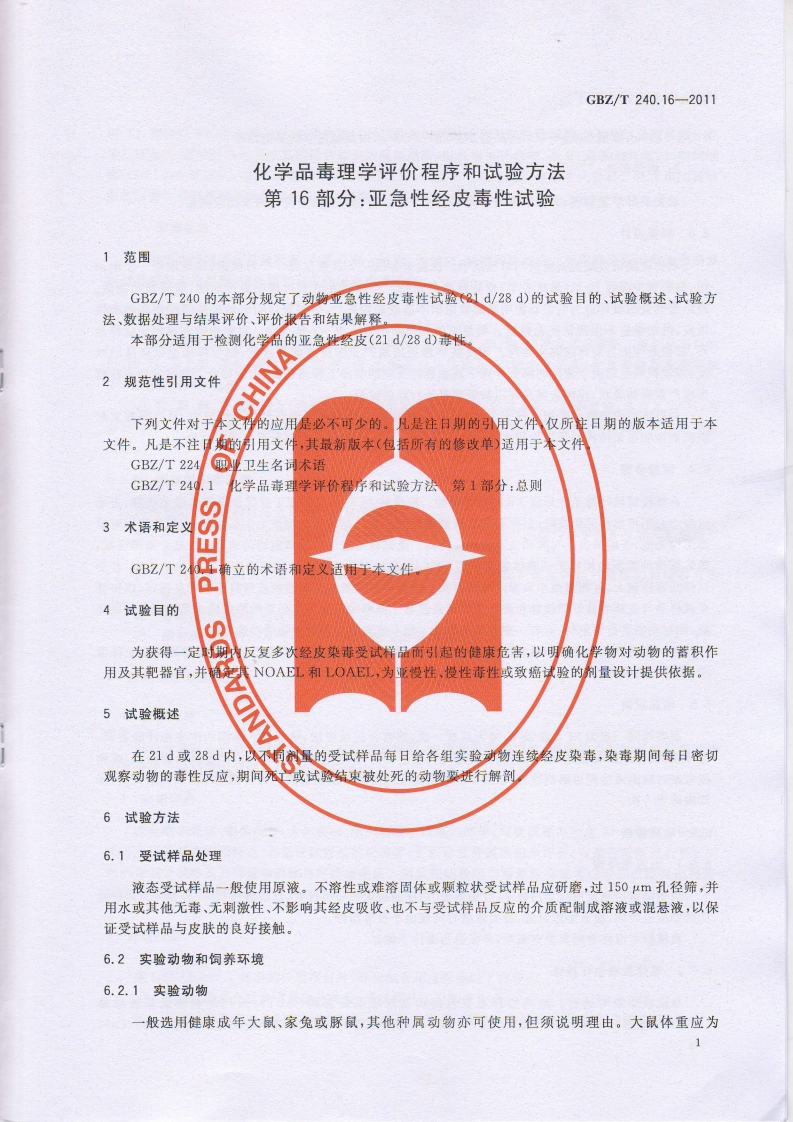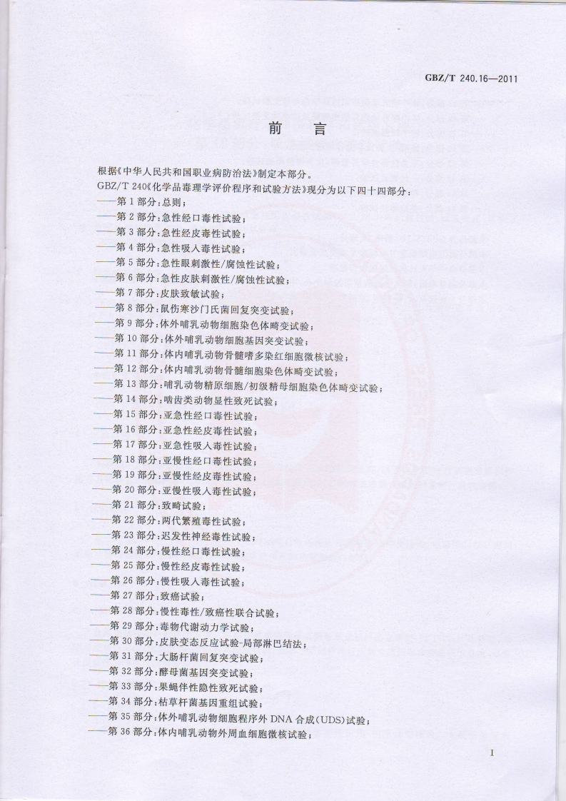 1CS13.100C52GBZ中华人民共和国国家职业卫生标准GBZ/T240.16-2011化学品毒理学评价程序和试验方法第16部分:亚急性经皮毒性试验Procedures and tests for toxicological evaluations of chemicals-Part 16:Sub-acute dermal toxicity test2011-08-19发布2012-03-01实施中华人民共和国卫生部发布