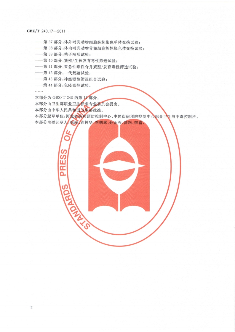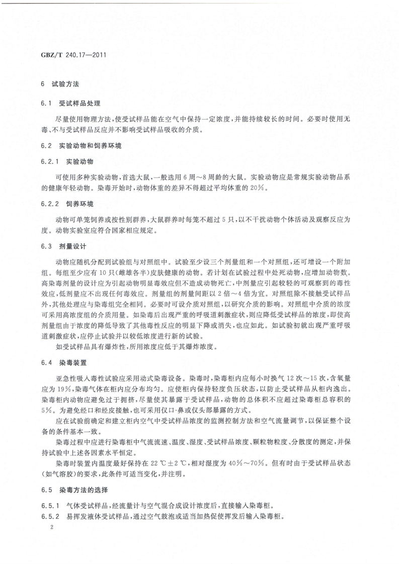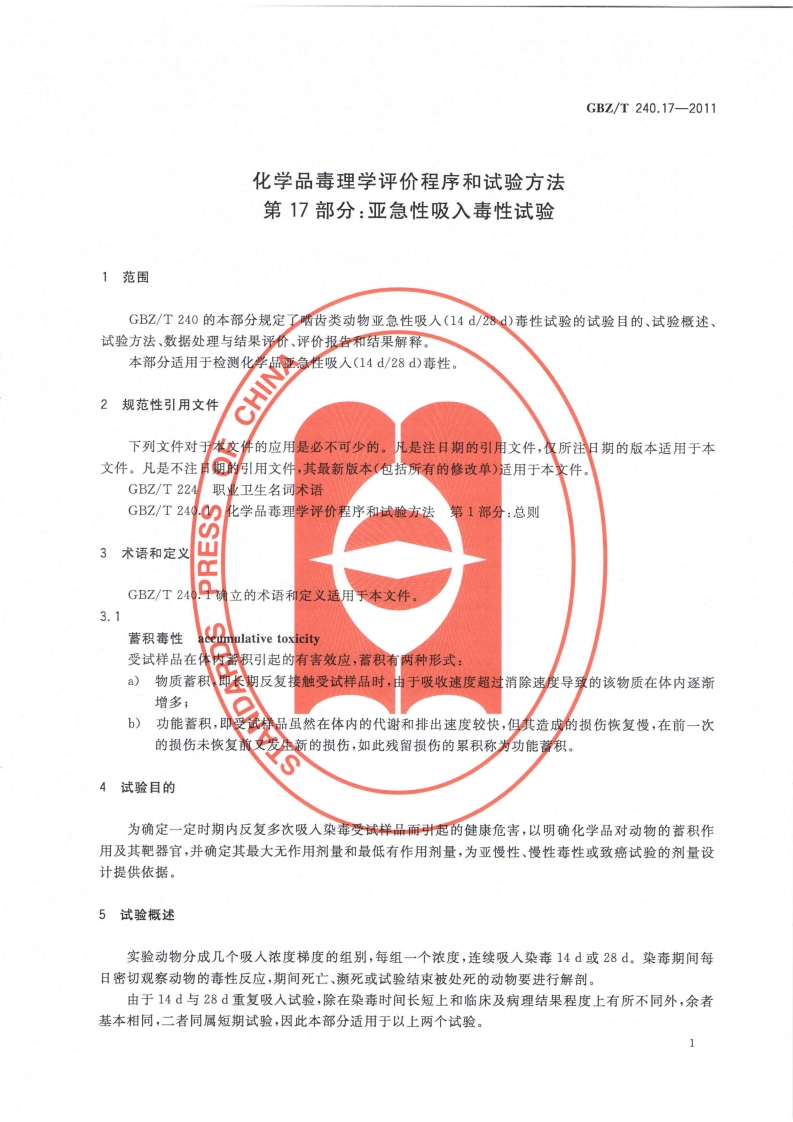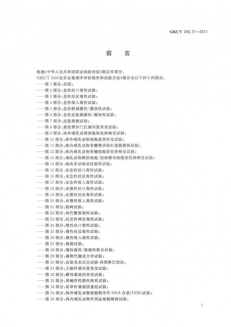 ICS13.100C52GBZ中华人民共和国国家职业卫生标准GBZ/T240.17-2011化学品毒理学评价程序和试验方法第17部分:亚急性吸入毒性试验Procedures and tests for toxicological evaluations of chemicals-Part 17:Sub-acute inhalation toxicity test2011-08-19发布2012-03-01实施中华人民共和国卫生部发布
