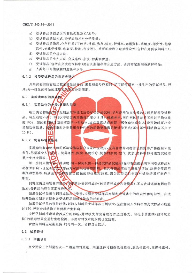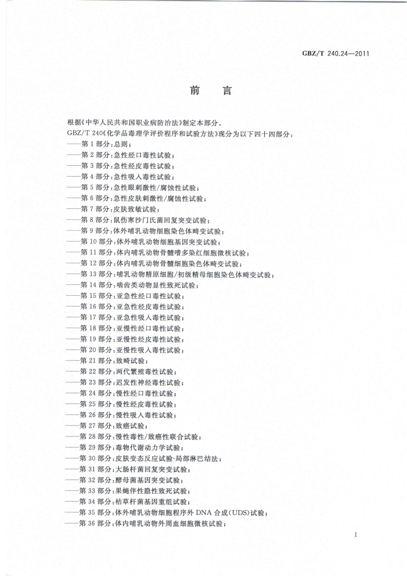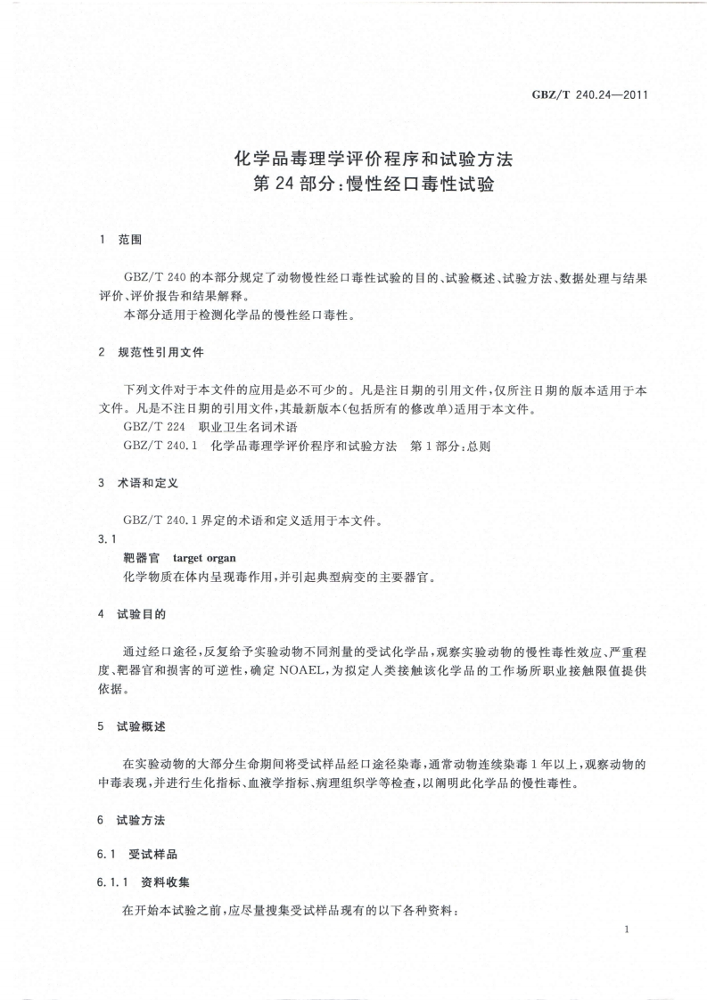 ICS13.100C52GBZ中华人民共和国国家职业卫生标准GBZ/T240.24-2011化学品毒理学评价程序和试验方法第24部分:慢性经口毒性试验Procedures and tests for toxicological evaluations of chemicals-Part 24:Chronic oral toxicity test2011-08-19发布2012-03-01实施数码防仍中华人民共和国卫生邵发布