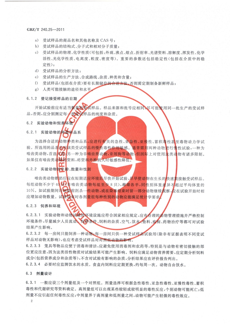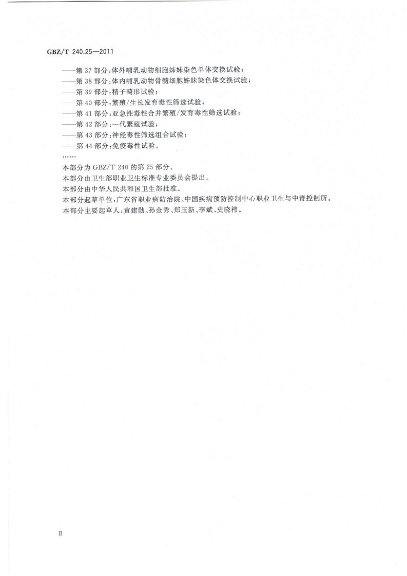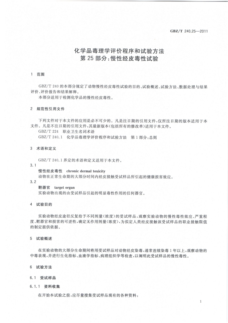 ICS13.100C52GBZ中华人民共和国国家职业卫生标准GBZ/T240.25-2011化学品毒理学评价程序和试验方法第25部分:慢性经皮毒性试验Procedures and tests for toxicological evaluations of chemicals-Part 25:Chronic dermal toxicity test2011-08-19发布2012-03-01实施中华人民共和国卫生部发布数码防