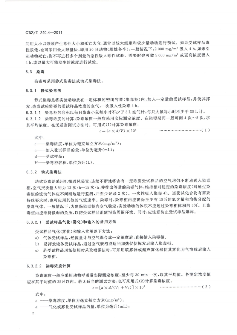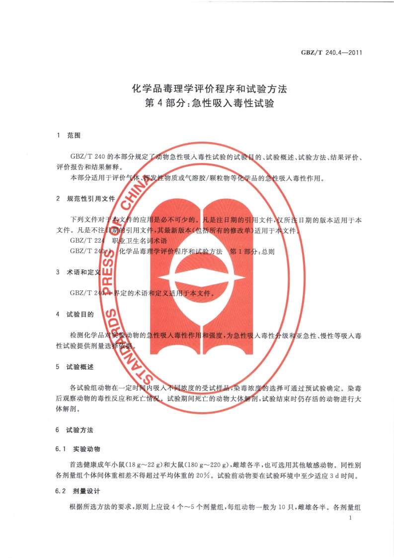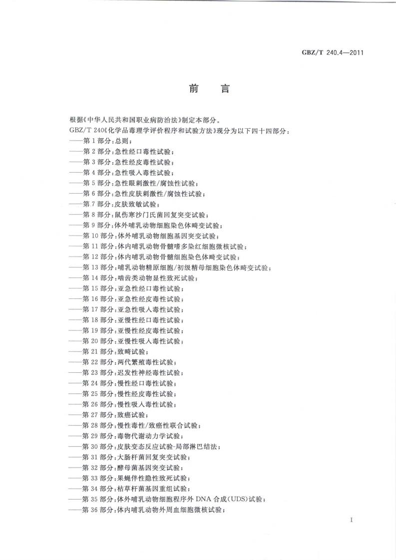 ICS13.100C52GBZ中华人民共和国国家职业卫生标准GBZ/T240.4-2011化学品毒理学评价程序和试验方法第4部分:急性吸入毒性试验Procedures and tests for toxicological evaluations of chemicals-Part 4:Acute inhalation toxicity test2011-08-19发布2012-03-01实施中华人民共和国卫生部发布