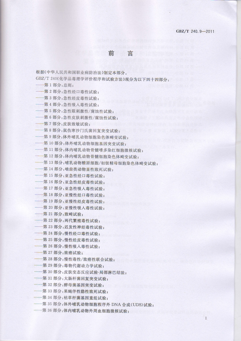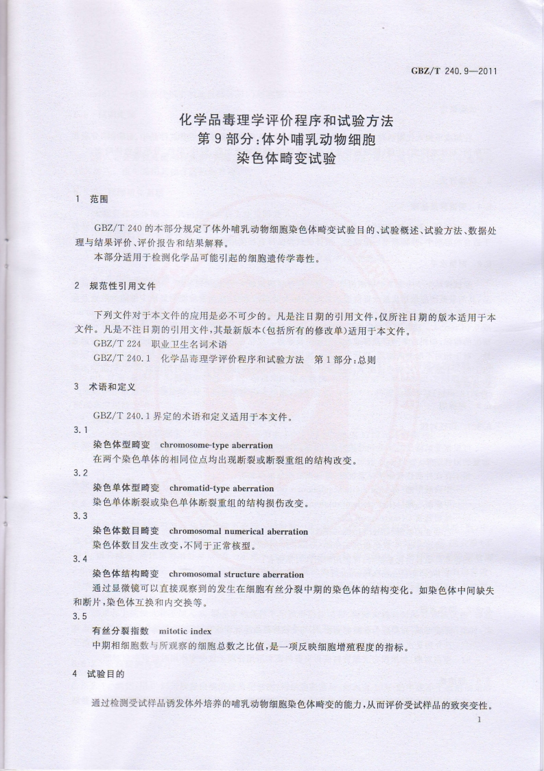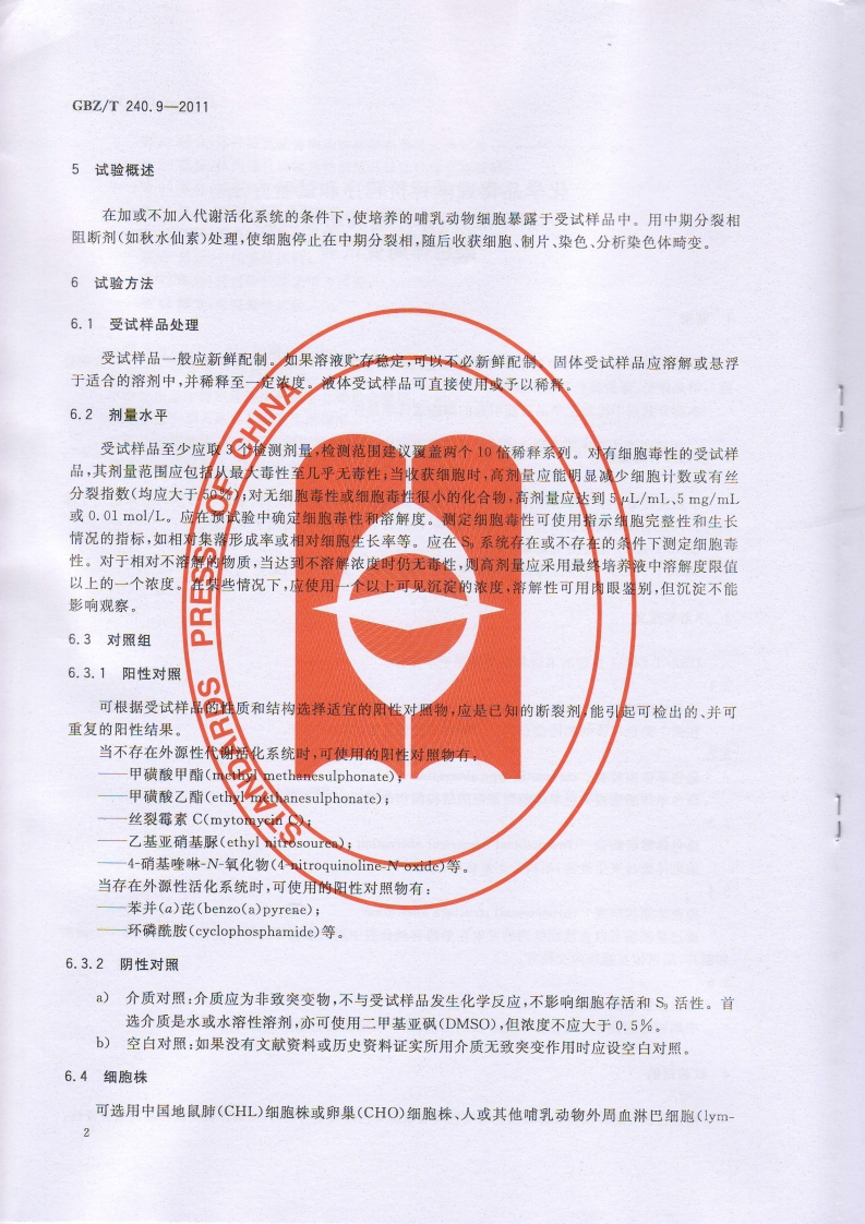 1CS13.100C52中华人民共和国国家职业卫生标准GBZ/T240.9-2011化学品毒理学评价程序和试验方法第9部分:体外哺乳动物细胞染色体畸变试验Procedures and tests for toxicological evaluations of chemicals-Part 9:In vitro mammalian chromosome aberration test2011-08-19发布2012-03-01实施中华人民共和国卫生部发布