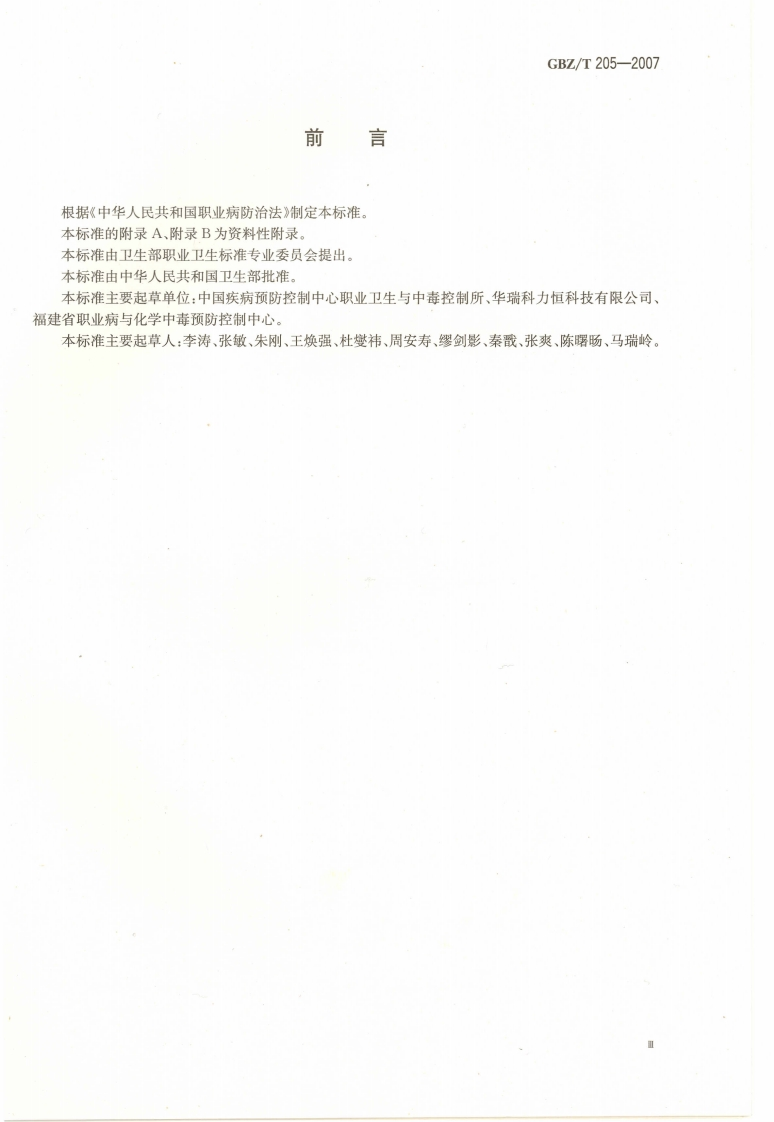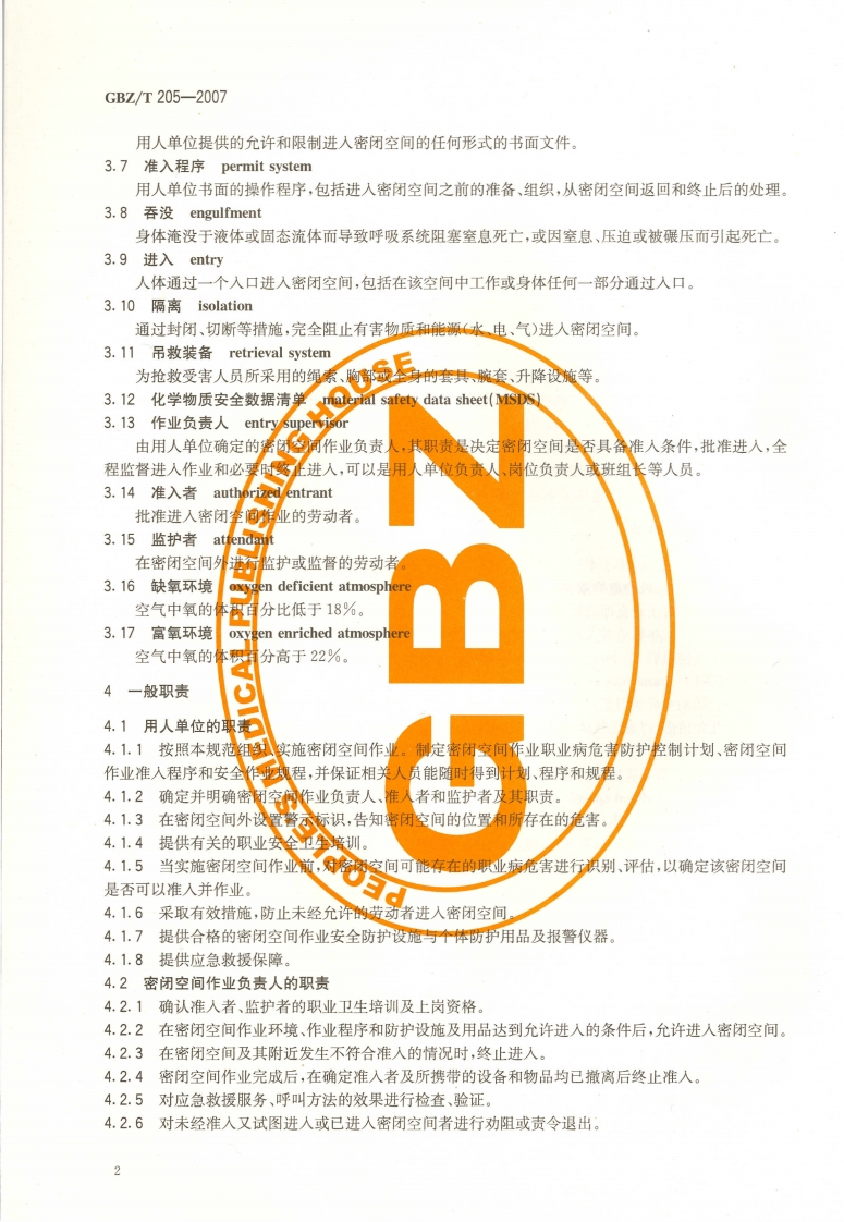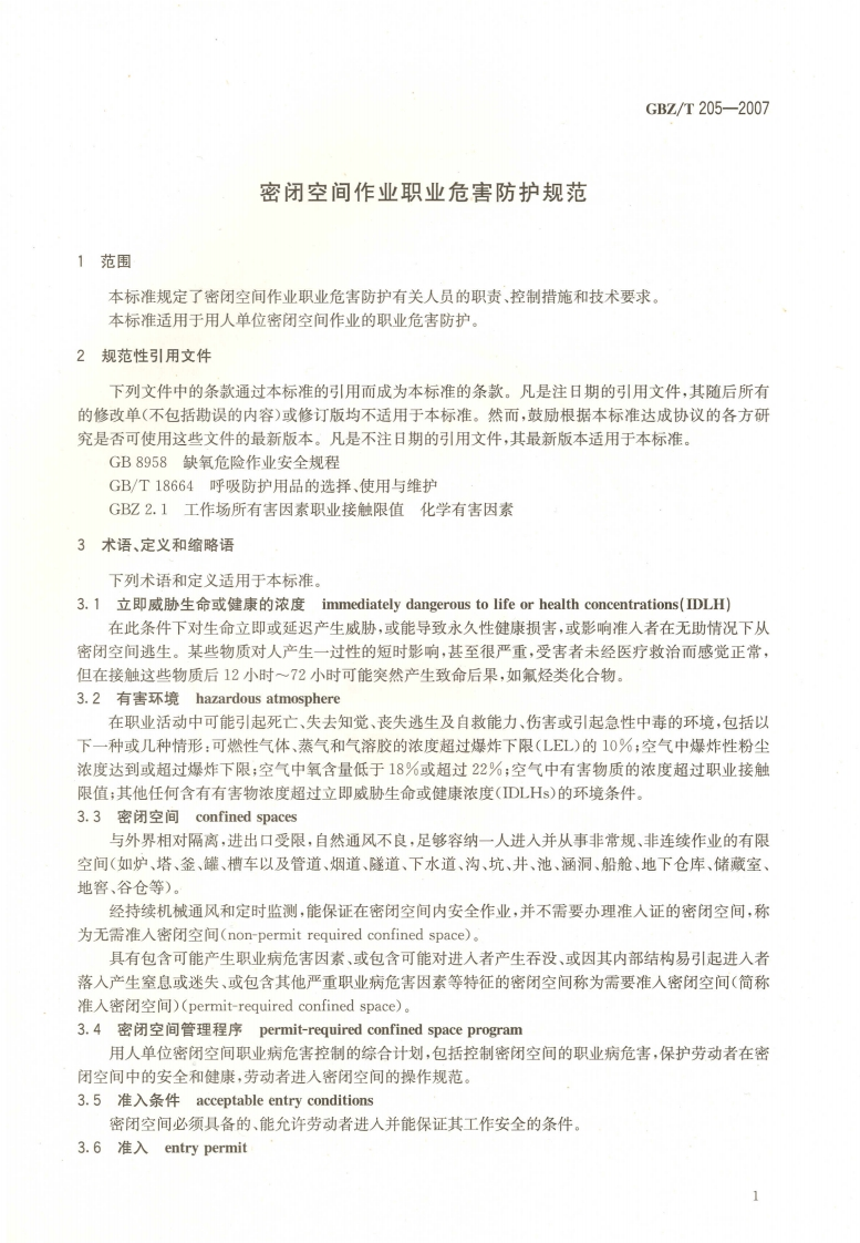 密闭空间作业职业危害防护规范Specificationofpreventionandcontrolonoccupationalhazardsinconfinedspace348072@abc4天前发布关注私信6.85MB15页038密闭空间作业职业危害防护规范Specificationofpreventionandcontrolonoccupationalhazardsinconfinedspace此内容为付费资源,请付费后查看¥13¥19黄金会员免费钻石会员免费立即购买您当前未登录!建议登陆后购买,可保存购买订单付费资源 第1页 / 共15页 第2页 / 共15页 第3页 / 共15页 第4页 / 共15页 第5页 / 共15页 试读已结束,还剩10页,您可下载完整版后进行离线阅读 THE END标准规范 文本预览 ICs13.100c52GBZ中华人民共和国国家职业卫生标准GBZ/T205-2007密闭空间作业职业危害防护规范Specification of prevention and control on occupationalhazards in confined space2007-09-25发布2008-03-01实施人民里生地《秋P M P H十中华人民共和国卫生邵发布本到洗 查看更多 收起部分 喜欢就支持一下吧收藏