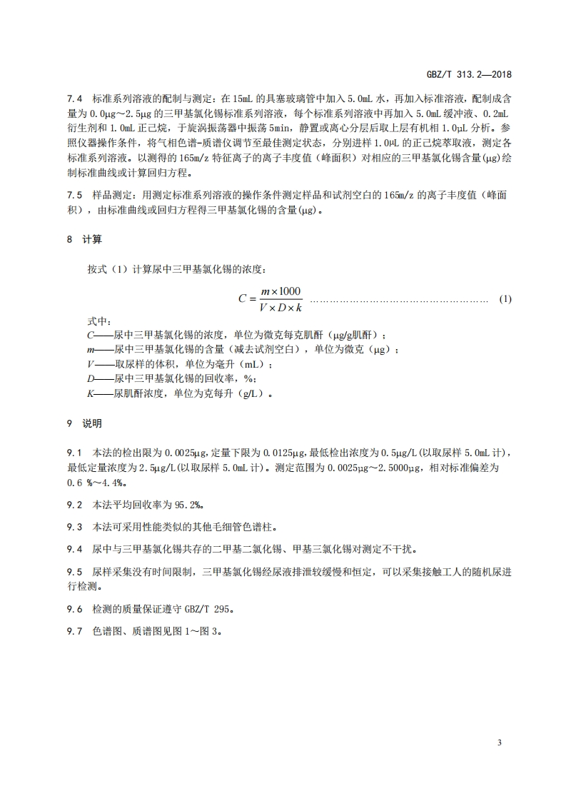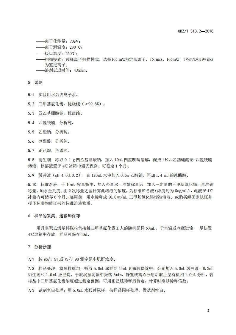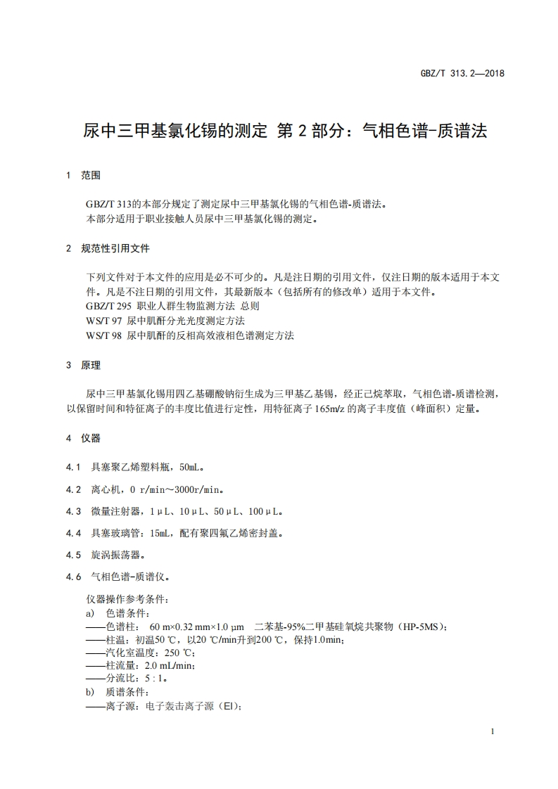 尿中三甲基氯化锡的测定第2部分_气相色谱-质谱法Determinationoftrimethyltinchloride(TMT)inurinePart2_Gaschromatographic-massmethod348072@abc3天前发布关注私信0.40MB6页031尿中三甲基氯化锡的测定第2部分_气相色谱-质谱法Determinationoftrimethyltinchloride(TMT)inurinePart2_Gaschromatographic-massmethod此内容为付费资源,请付费后查看¥13¥19黄金会员免费钻石会员免费立即购买您当前未登录!建议登陆后购买,可保存购买订单付费资源 第1页 / 共6页 第2页 / 共6页 第3页 / 共6页 第4页 / 共6页 第5页 / 共6页 试读已结束,还剩1页,您可下载完整版后进行离线阅读 THE END标准规范 文本预览 ICS13.100C52GBZ中华人民共和国国家职业卫生标准GBZ/T313.2-2018尿中三甲基氯化锡的测定第2部分:气相色谱-质谱法Determination of trimethyltin chloride (TMT)in urine-Part2:Gas chromatographic -mass method2018-08-16发布2019-01-01实施中华人民共和国国家卫生健康委员会发布 查看更多 收起部分 喜欢就支持一下吧收藏