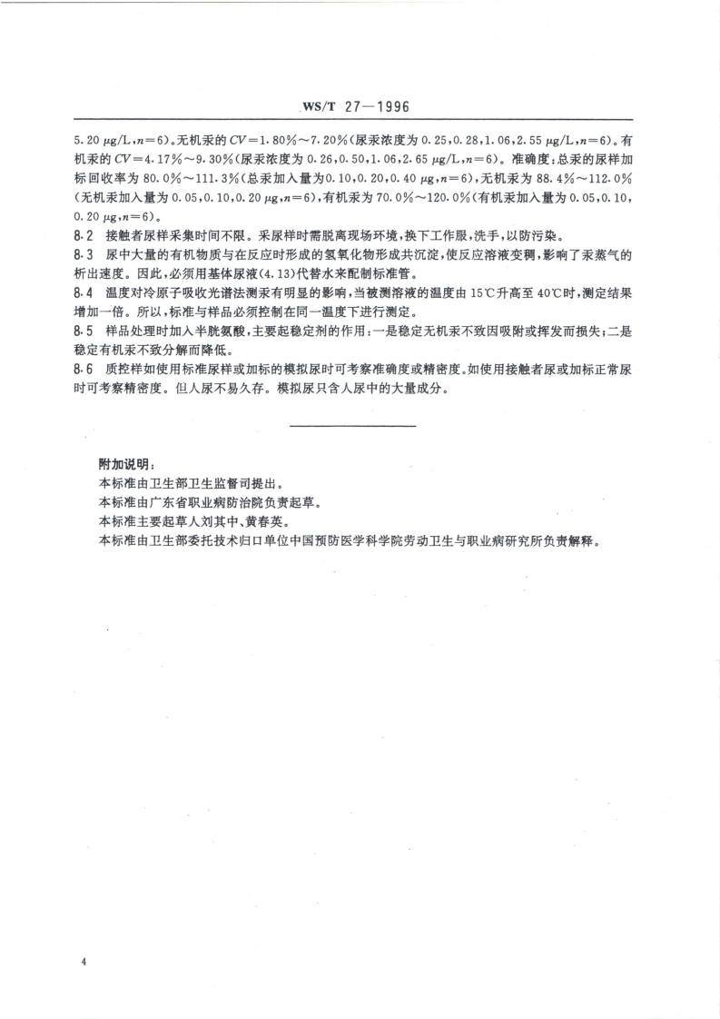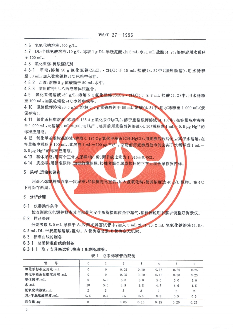 尿中有机(甲基)汞、无机汞和总汞的分别测定方法选择性还原-冷原子吸收光谱法Urine-Separatedeterminationoforganicinorganicandtotalmercury-Selectivereductioncoldatomicabsorptionspectrometricmethod348072@abc3天前发布关注私信2.38MB5页045尿中有机(甲基)汞、无机汞和总汞的分别测定方法选择性还原-冷原子吸收光谱法Urine-Separatedeterminationoforganicinorganicandtotalmercury-Selectivereductioncoldatomicabsorptionspectrometricmethod此内容为付费资源,请付费后查看¥13¥19黄金会员免费钻石会员免费立即购买您当前未登录!建议登陆后购买,可保存购买订单付费资源 第1页 / 共5页 第2页 / 共5页 第3页 / 共5页 第4页 / 共5页 第5页 / 共5页 已完成全部阅读,共5页 THE END标准规范 文本预览 WS中华人民共和国卫生行业标准WS/T27-1996尿中有机(甲基)汞、无机汞和总汞的分别测定方法选择性还原-冷原子吸收光谱法Urine-Separate determination of organic,inorganic and total mercury-Selective reductioncold atomic absorption spectrometric method1996-10-14发布1997-05-01实施Φ中华人民共和国卫生部发布 查看更多 收起部分 喜欢就支持一下吧收藏