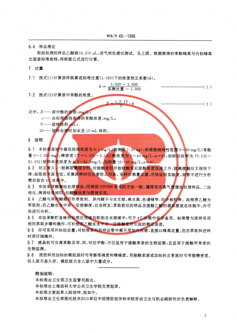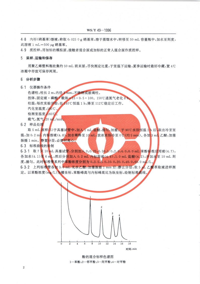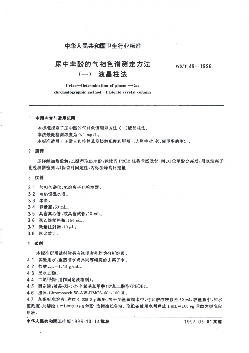 尿中苯酚的气相色谱测定方法液晶柱法-)Urine-Determinationofphenol-Gaschromatographicmethod-ILiquidcrystalcolumn348072@abc前天发布关注私信1.89MB4页036尿中苯酚的气相色谱测定方法液晶柱法-)Urine-Determinationofphenol-Gaschromatographicmethod-ILiquidcrystalcolumn此内容为付费资源,请付费后查看¥13¥19黄金会员免费钻石会员免费立即购买您当前未登录!建议登陆后购买,可保存购买订单付费资源 第1页 / 共4页 第2页 / 共4页 第3页 / 共4页 第4页 / 共4页 已完成全部阅读,共4页 THE END标准规范 文本预览 WS中华人民共和国卫生行业标准Ws/T49-1996尿中苯酚的气相色谱测定方法(一)液晶柱法Urine-Determination of phenol-Gaschromatographic method-I Liquid crystal column1996-10-14发布1997-05-01实施中华人民共和国卫生部发布层查真伪 查看更多 收起部分 喜欢就支持一下吧收藏