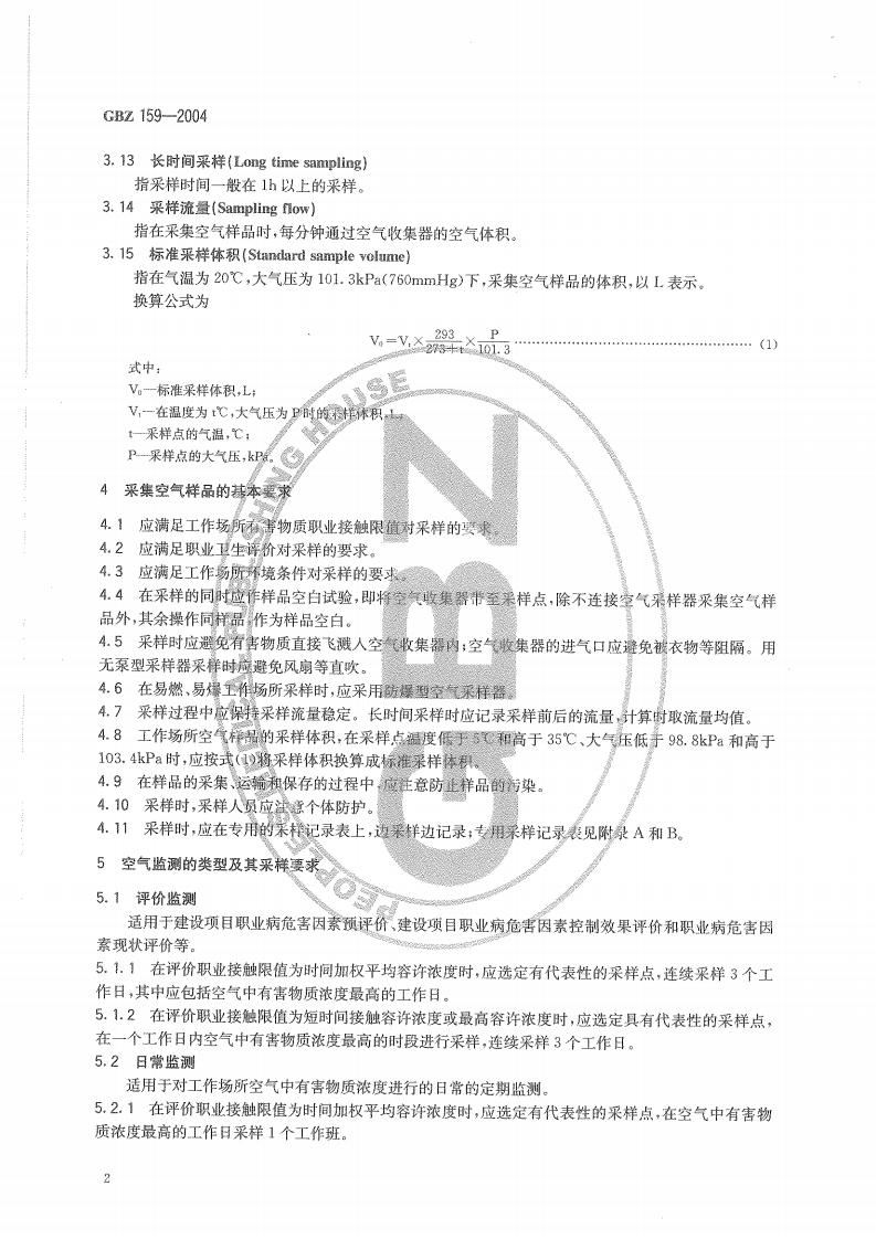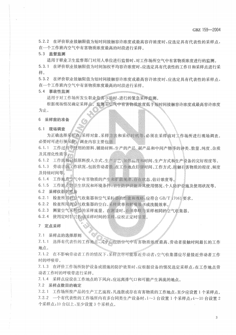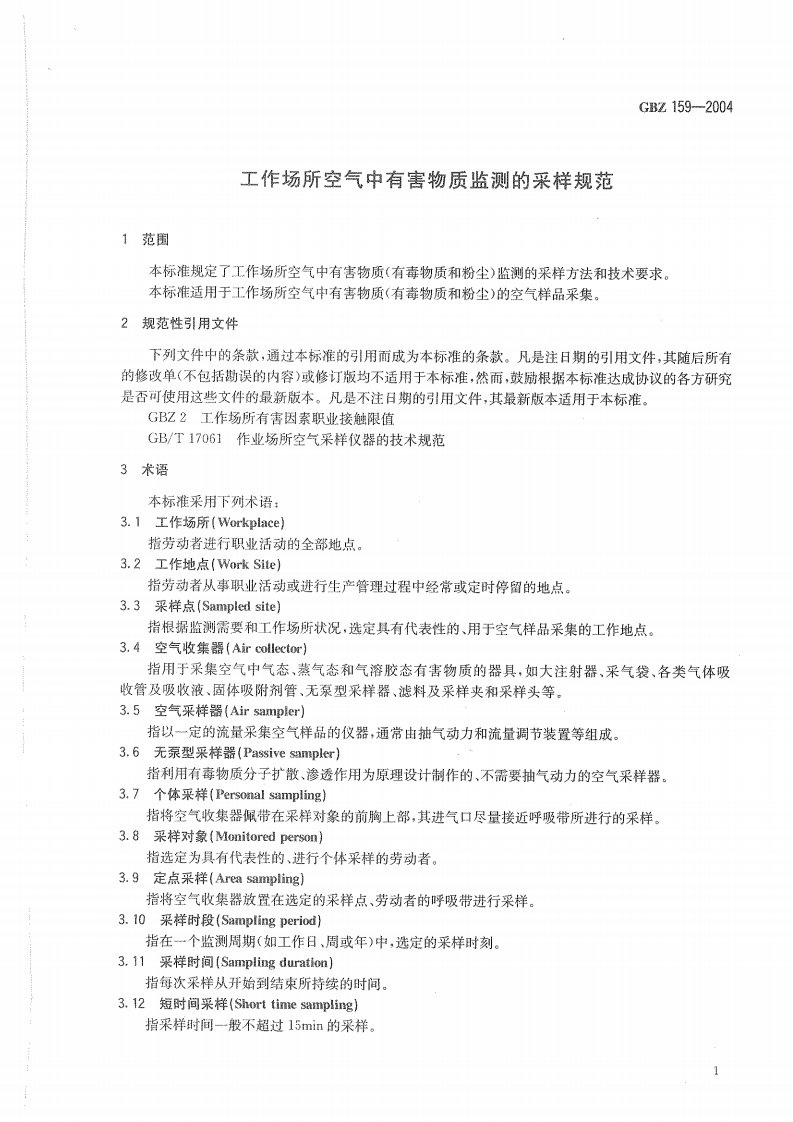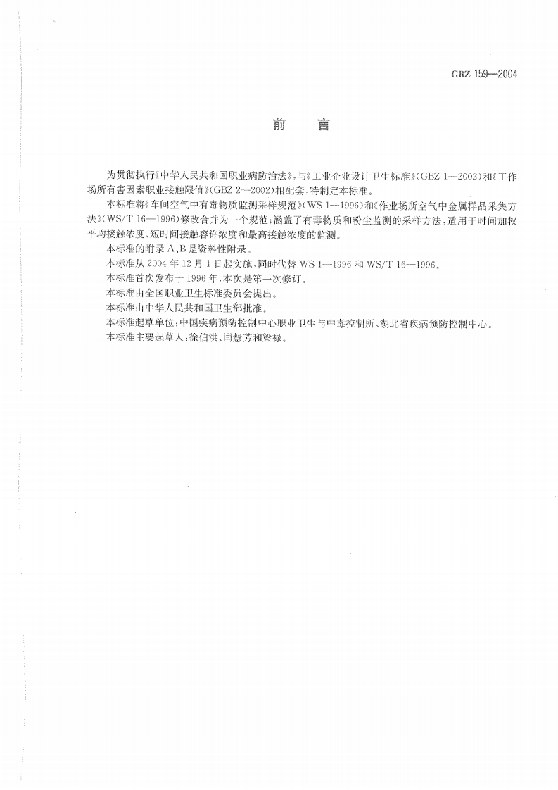 工作场所空气中有害物质监测的采样规范Specifcationsofairsamplingforhazardoussubstancesmonitoringintheworkplace348072@abc前天发布关注私信0.69MB11页036工作场所空气中有害物质监测的采样规范Specifcationsofairsamplingforhazardoussubstancesmonitoringintheworkplace此内容为付费资源,请付费后查看¥13¥19黄金会员免费钻石会员免费立即购买您当前未登录!建议登陆后购买,可保存购买订单付费资源 第1页 / 共11页 第2页 / 共11页 第3页 / 共11页 第4页 / 共11页 第5页 / 共11页 试读已结束,还剩6页,您可下载完整版后进行离线阅读 THE END标准规范 文本预览 ICs13.100c52GBZ中华人民共和国国家积业卫生标准GBZ159-2004工作场所空气中有害物质监测的采样规范Specifications of air samplingfor hazardous substances monitoring in the workplace2004-05-21发布2004-12-01实施中老人民共和国卫生邵发布 查看更多 收起部分 喜欢就支持一下吧收藏