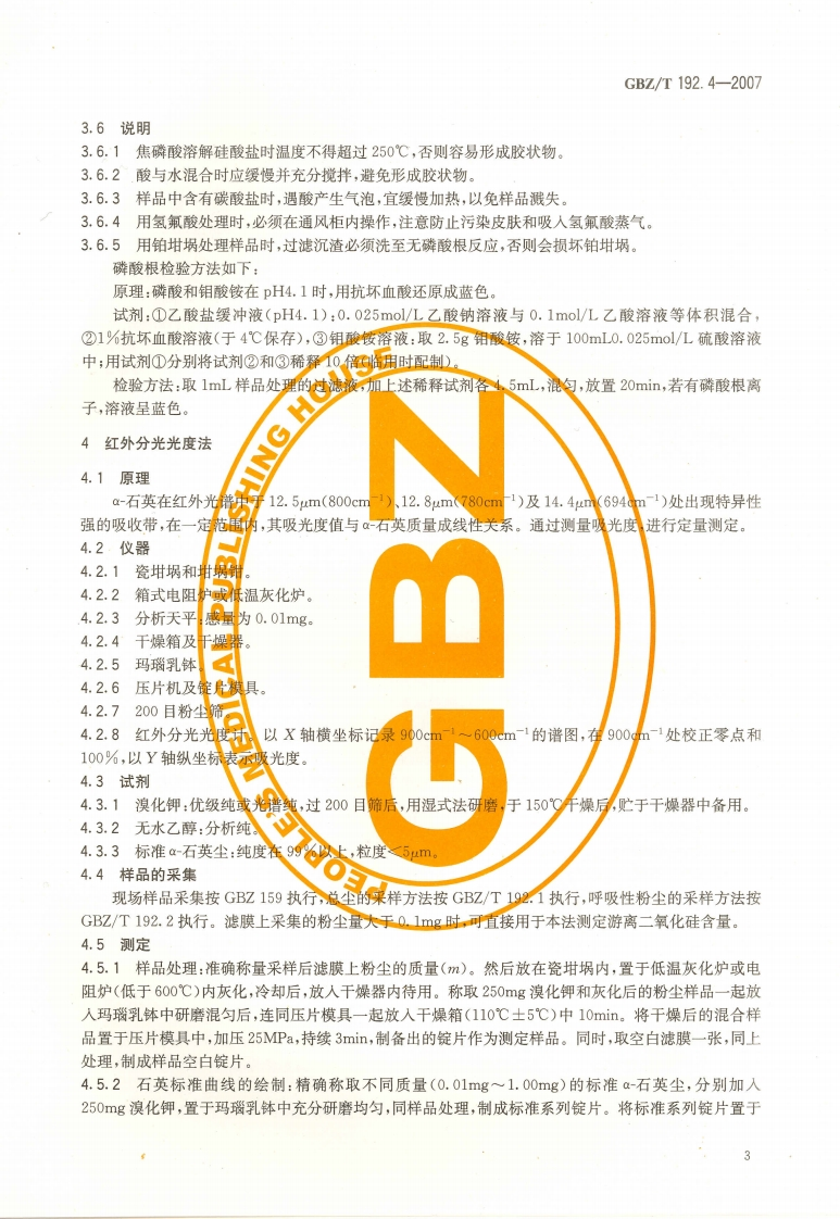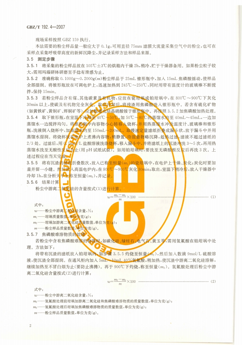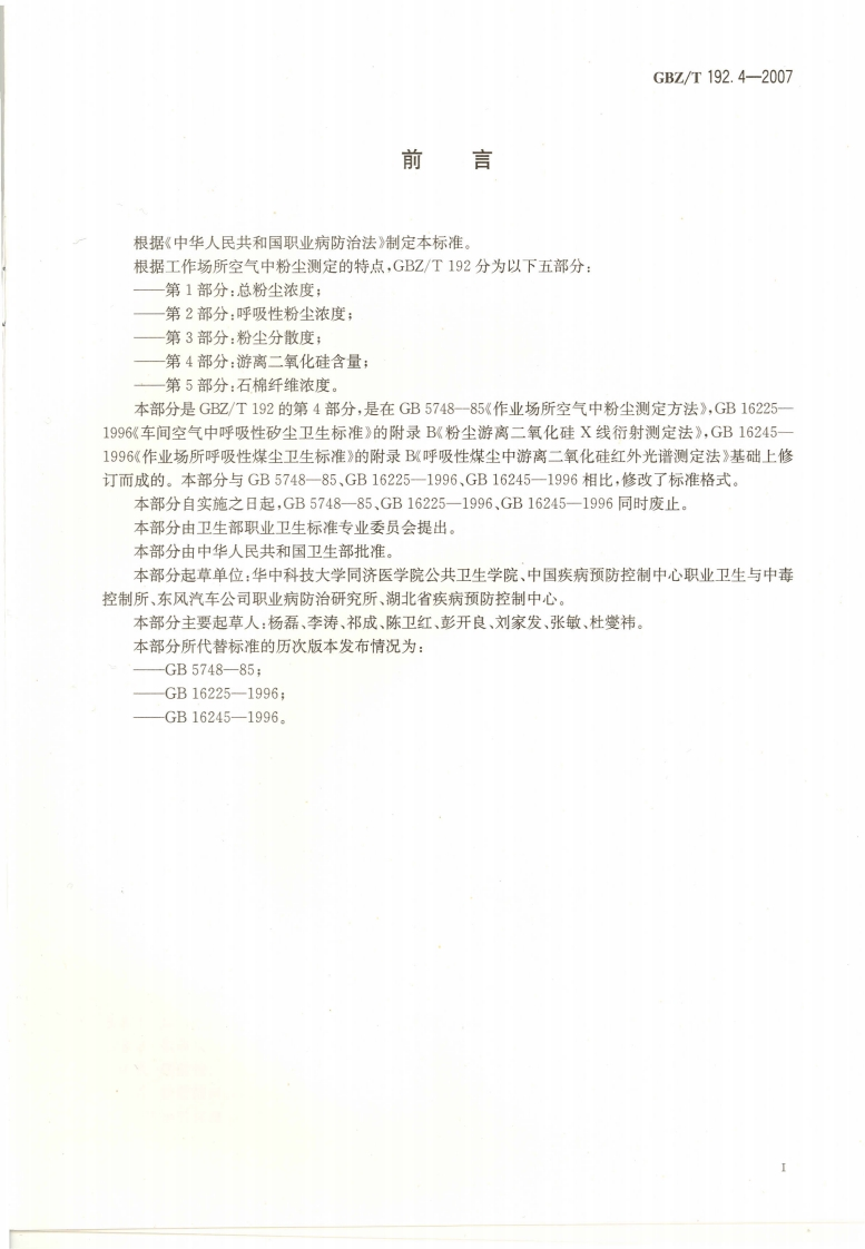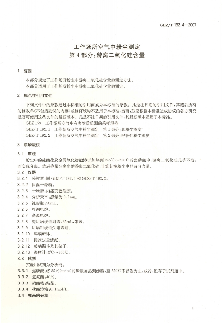 工作场所空气中粉尘测定第4部分_游离二氧化硅含量DeterminationofdustintheairofworkplacePart4_Contentoffreesilicaindust348072@abc3天前发布关注私信4.28MB9页046工作场所空气中粉尘测定第4部分_游离二氧化硅含量DeterminationofdustintheairofworkplacePart4_Contentoffreesilicaindust此内容为付费资源,请付费后查看¥13¥19黄金会员免费钻石会员免费立即购买您当前未登录!建议登陆后购买,可保存购买订单付费资源 第1页 / 共9页 第2页 / 共9页 第3页 / 共9页 第4页 / 共9页 第5页 / 共9页 试读已结束,还剩4页,您可下载完整版后进行离线阅读 THE END标准规范 文本预览 ICs13.100c52GBZ中华人民共和国国家职业卫生标准GBZT192.4-2007工作场所空气中粉尘测定第4部分:游离二氧化硅含量Determination of dust in the air of workplace-Part 4:Content of free silica in dust2007-06-18发布2007-12-30实施@人氏卫生典旅融中华人民共和国卫生邵发布P M P H我宝 查看更多 收起部分 喜欢就支持一下吧收藏