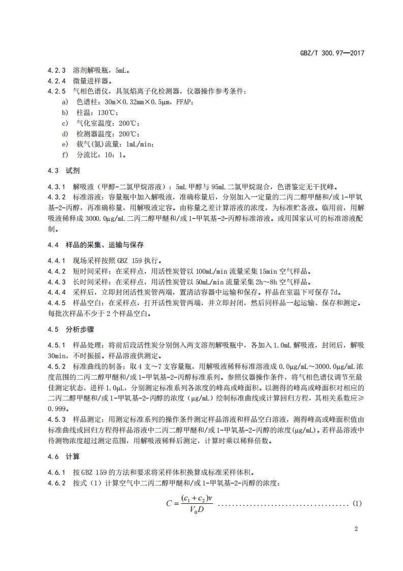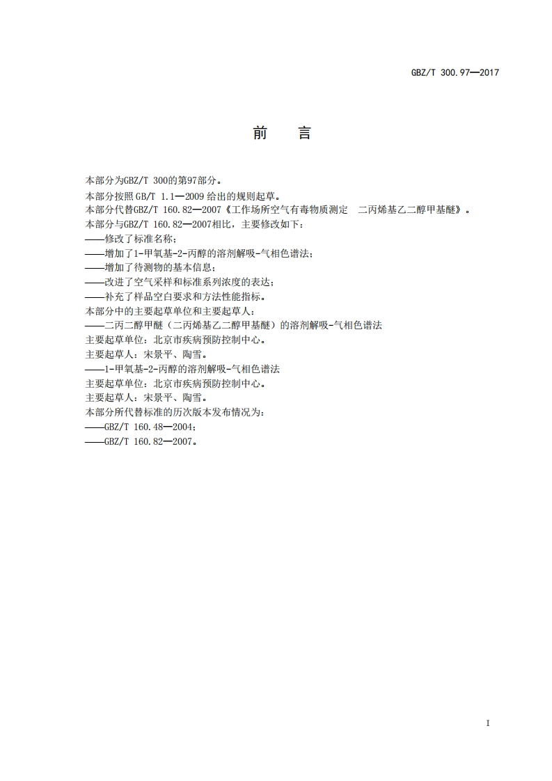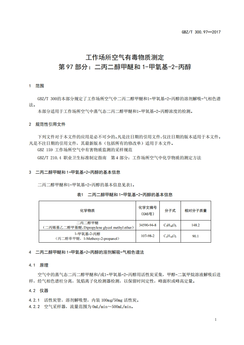 ICS13.100C52FBZ中华人民共和国国家职业卫生标准GBZ/T300.97-2017代替GBZ/T160.82一2007工作场所空气有毒物质测定第97部分:二丙二醇甲醚和1-甲氧基-2丙醇Determination of toxic substances in workplace air-Part 97:Dipropylene glycol methyl ether and 1-methoxy-2-propanol2017-11-09发布2018-05-01实施中华人民共和国国家卫生和计划生育委员会发布