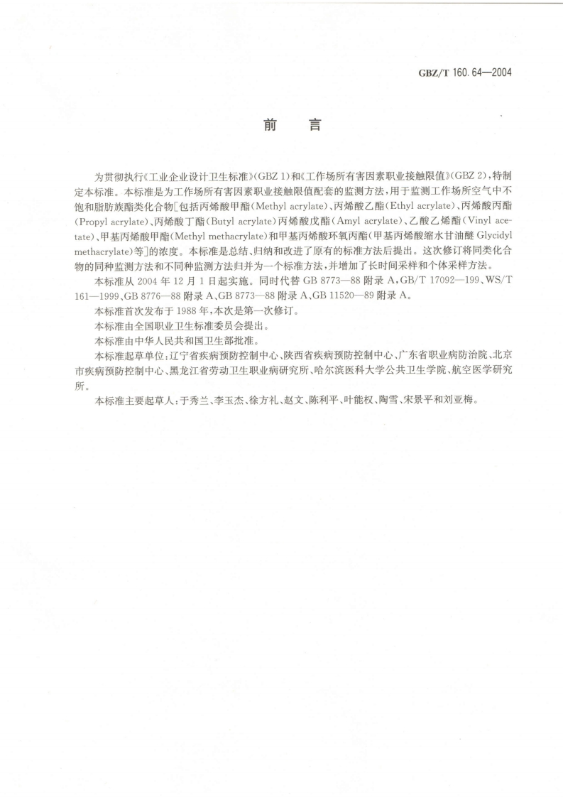 工作场所空气有毒物质测定不饱和脂肪族酯类化合物Methodsfordeterminationofunsaturatedaliphaticestersintheairofworkplace348072@abc3天前发布关注私信4.17MB9页045工作场所空气有毒物质测定不饱和脂肪族酯类化合物Methodsfordeterminationofunsaturatedaliphaticestersintheairofworkplace此内容为付费资源,请付费后查看¥13¥19黄金会员免费钻石会员免费立即购买您当前未登录!建议登陆后购买,可保存购买订单付费资源 第1页 / 共9页 第2页 / 共9页 第3页 / 共9页 第4页 / 共9页 第5页 / 共9页 试读已结束,还剩4页,您可下载完整版后进行离线阅读 THE END标准规范 文本预览 Ics13.100c52GBZ中华人民共和国国家职业卫生标准GBZ/T160.64-2004工作场所空气有毒物质测定不饱和脂肪族酯类化合物Methods for determination of unsaturated aliphatic estersin the air of workplace2004-05-21发布2004-12-01实施中华人民已此和国卫生邻发布 查看更多 收起部分 喜欢就支持一下吧收藏