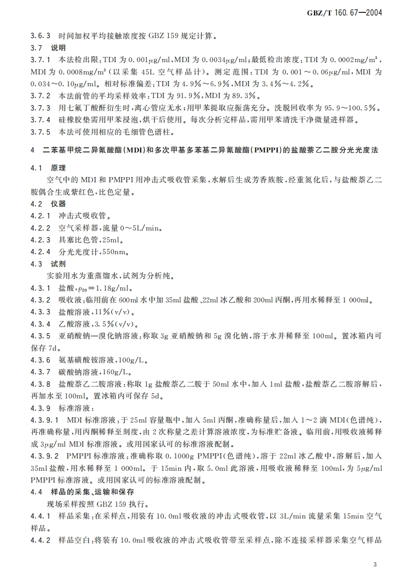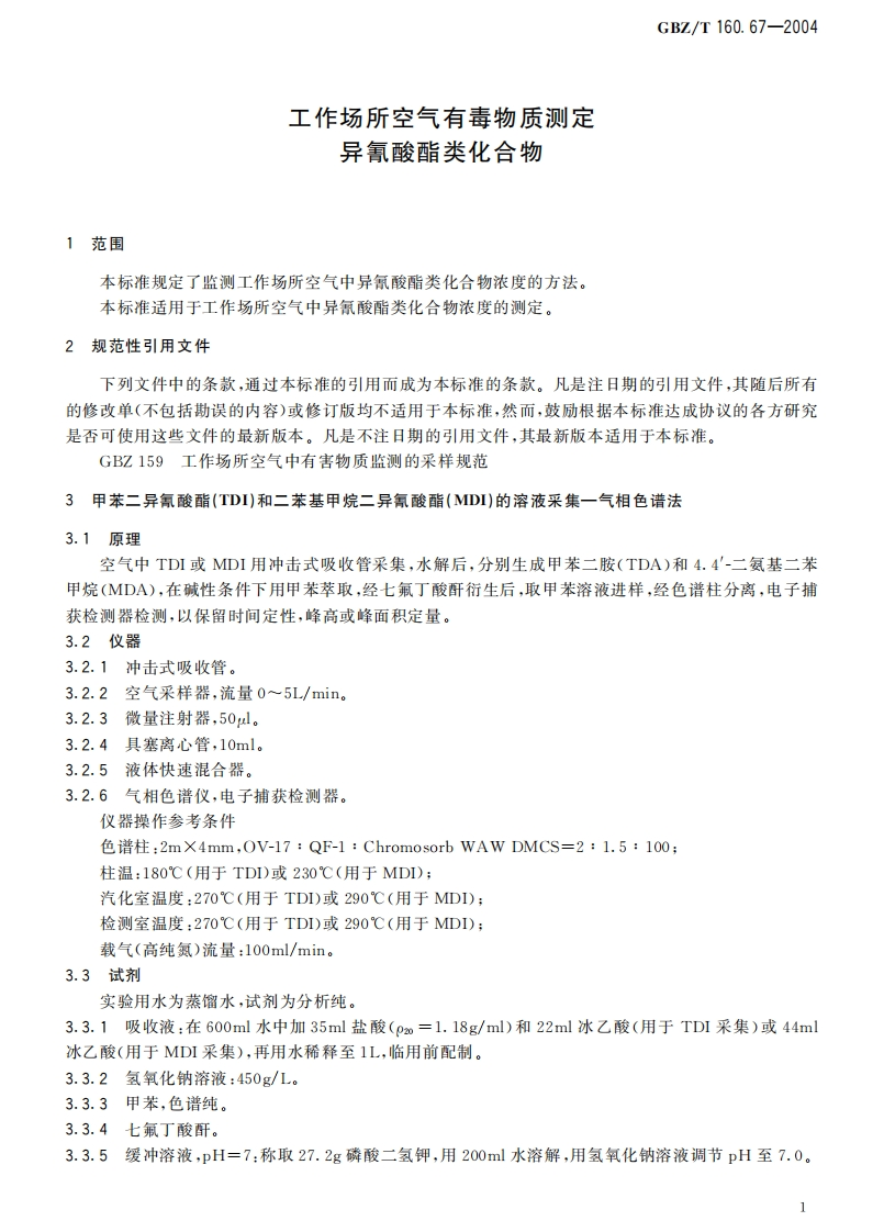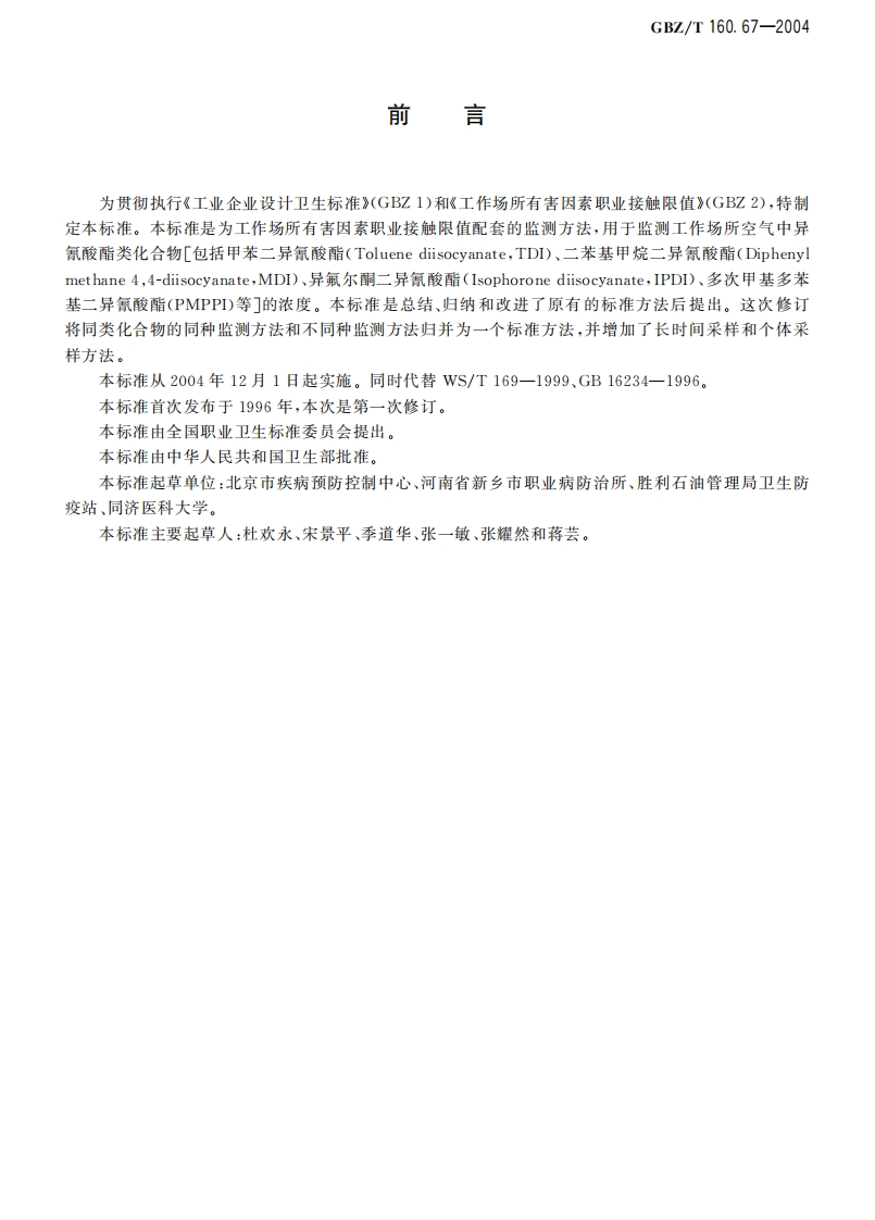 工作场所空气有毒物质测定异氰酸酯类化合物Methodsfordeterminationofisocyanatesintheairofworkplace348072@abc3天前发布关注私信2.11MB8页034工作场所空气有毒物质测定异氰酸酯类化合物Methodsfordeterminationofisocyanatesintheairofworkplace此内容为付费资源,请付费后查看¥13¥19黄金会员免费钻石会员免费立即购买您当前未登录!建议登陆后购买,可保存购买订单付费资源 第1页 / 共8页 第2页 / 共8页 第3页 / 共8页 第4页 / 共8页 第5页 / 共8页 试读已结束,还剩3页,您可下载完整版后进行离线阅读 THE END标准规范 文本预览 1Cs13.100C52GBZ中华人民共和国国家职业卫生标住GBZ/T160.67-2004工作场所空气有毒物质测定异氰酸酯类化合物Methods for determination of isocyanatesin the air of workplace2004-05-21发布2004-12-01实施中华人民共和国卫生邻发布 查看更多 收起部分 喜欢就支持一下吧收藏