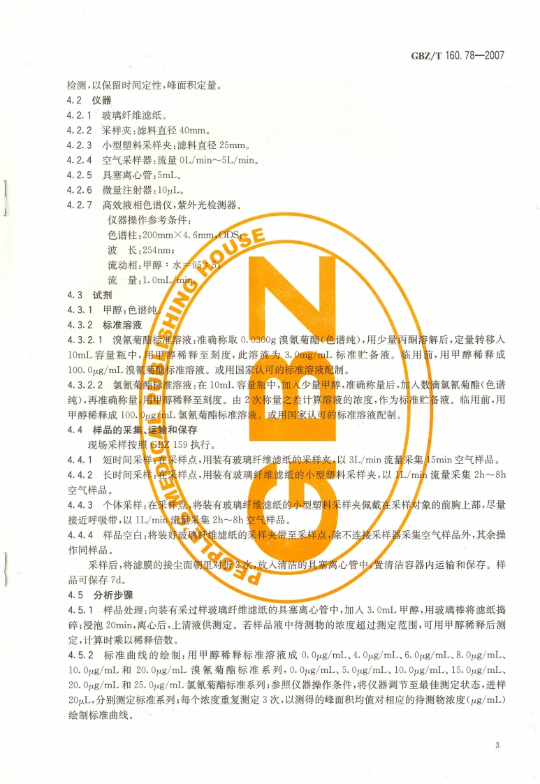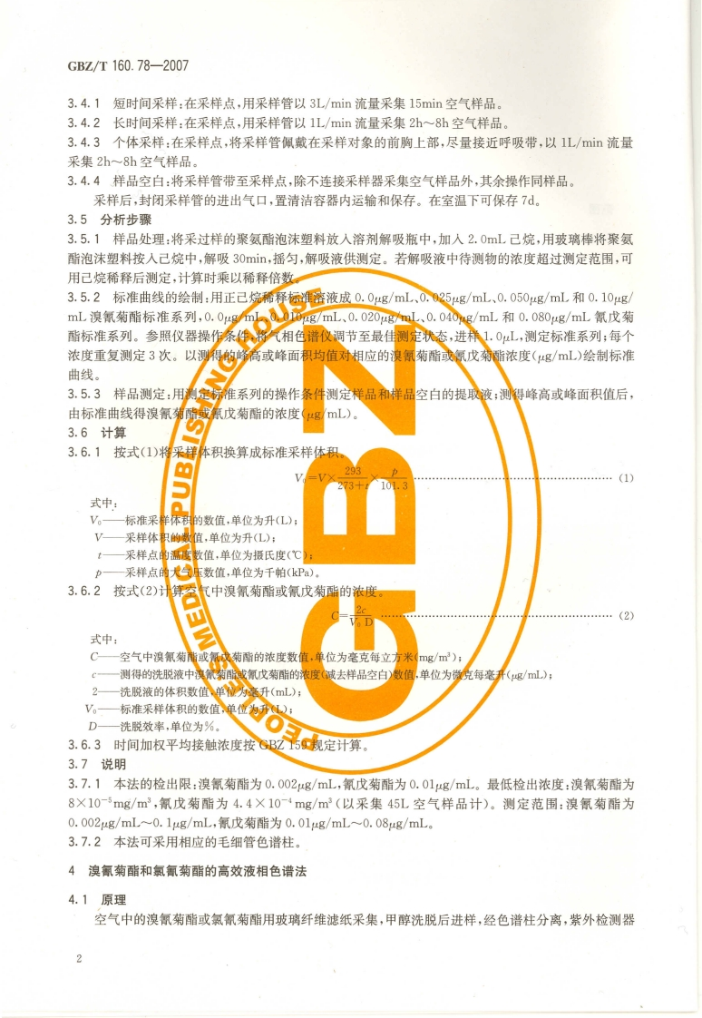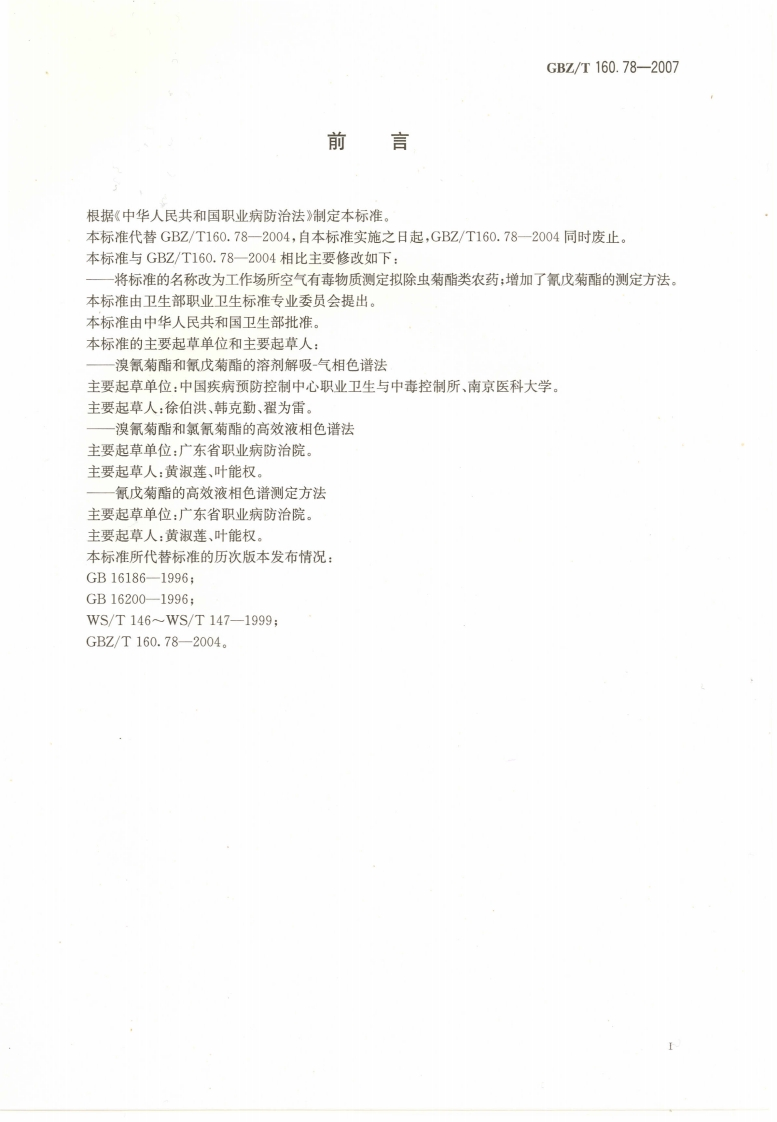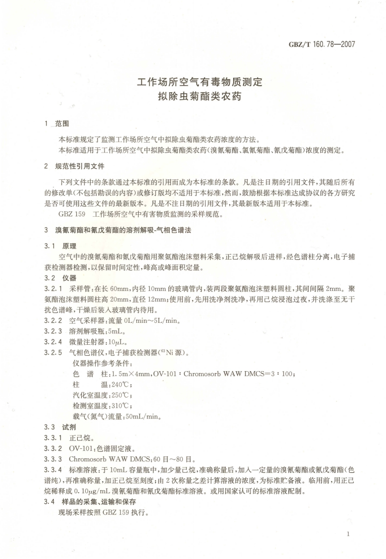 工作场所空气有毒物质测定拟除虫菊酯类农药Determinationofpyrethriodpesticidesintheairofworkplace348072@abc4天前发布关注私信3.68MB8页046工作场所空气有毒物质测定拟除虫菊酯类农药Determinationofpyrethriodpesticidesintheairofworkplace此内容为付费资源,请付费后查看¥13¥19黄金会员免费钻石会员免费立即购买您当前未登录!建议登陆后购买,可保存购买订单付费资源 第1页 / 共8页 第2页 / 共8页 第3页 / 共8页 第4页 / 共8页 第5页 / 共8页 试读已结束,还剩3页,您可下载完整版后进行离线阅读 THE END标准规范 文本预览 ICs13.100c52GBZ中华人民共和国国家职业卫生标准GBZ/T160.78-2007代替GBZ/T160.78-2004工作场所空气有毒物质测定拟除虫菊酯类农药Determination of pyrethriod pesticidesin the air of workplace2007-06-13发布2007-11-30实施@人氏里4典旅社PMPH写中华人民共和国卫生邵发布 查看更多 收起部分 喜欢就支持一下吧收藏