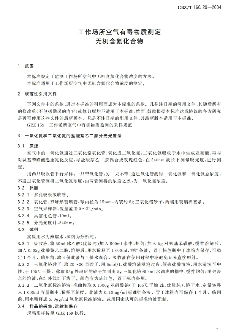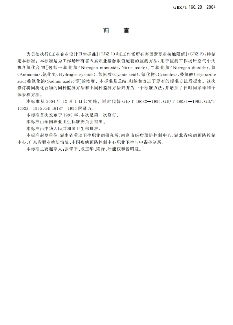 工作场所空气有毒物质测定无机含氮化合物Methodsfordeterminationofinorganicnitrogencompoundsintheairworkplace348072@abc4天前发布关注私信2.42MB9页050工作场所空气有毒物质测定无机含氮化合物Methodsfordeterminationofinorganicnitrogencompoundsintheairworkplace此内容为付费资源,请付费后查看¥13¥19黄金会员免费钻石会员免费立即购买您当前未登录!建议登陆后购买,可保存购买订单付费资源 第1页 / 共9页 第2页 / 共9页 第3页 / 共9页 第4页 / 共9页 第5页 / 共9页 试读已结束,还剩4页,您可下载完整版后进行离线阅读 THE END标准规范 文本预览 1Cs13.100C52GBZ中华人民共和国国家职业卫生标住GBZ/T160.29-2004工作场所空气有毒物质测定无机含氮化合物Methods for determination of inorganic nitrogen compoundsin the air workplace2004-05-21发布2004-12-01实施中华人民共和国卫生邻发布 查看更多 收起部分 喜欢就支持一下吧收藏