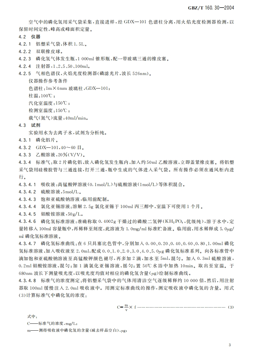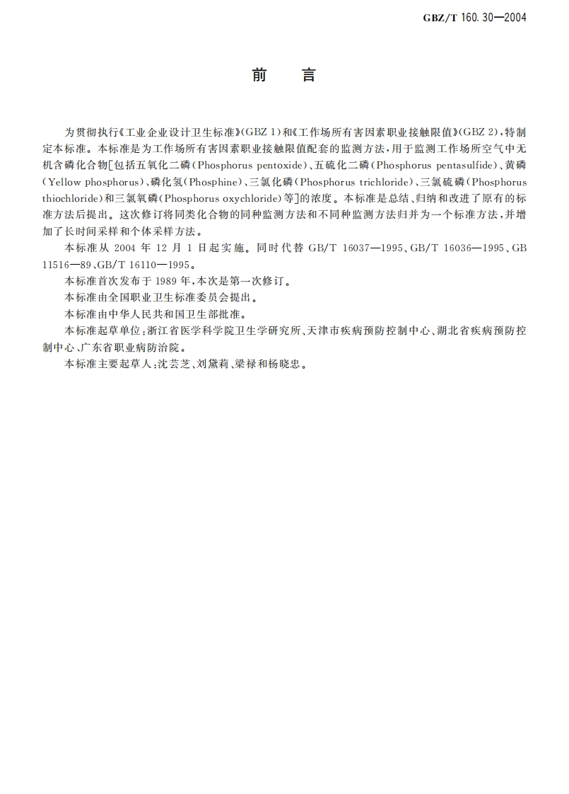 工作场所空气有毒物质测定无机含磷化合物Methodsfordeterminationofinorganicphosphoruscompoundsintheairofworkplace348072@abc4天前发布关注私信3.57MB13页022工作场所空气有毒物质测定无机含磷化合物Methodsfordeterminationofinorganicphosphoruscompoundsintheairofworkplace此内容为付费资源,请付费后查看¥13¥19黄金会员免费钻石会员免费立即购买您当前未登录!建议登陆后购买,可保存购买订单付费资源 第1页 / 共13页 第2页 / 共13页 第3页 / 共13页 第4页 / 共13页 第5页 / 共13页 试读已结束,还剩8页,您可下载完整版后进行离线阅读 THE END标准规范 文本预览 1Cs13.100C52GBZ中华人民共和国国家职业卫生标住GBZ/T160.30-2004工作场所空气有毒物质测定无机含磷化合物Methods for determination of inorganic phosphorus compoundsin the air of workplace2004-05-21发布2004-12-01实施中华人民共和国卫生邻发布 查看更多 收起部分 喜欢就支持一下吧收藏