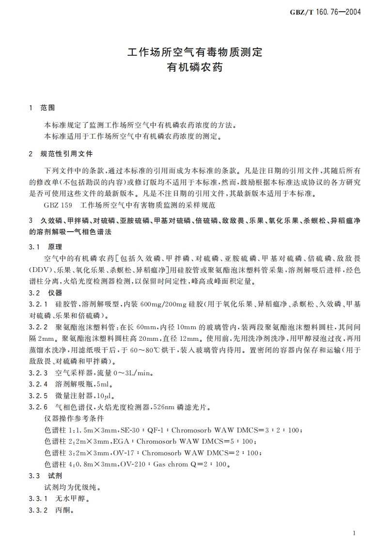 工作场所空气有毒物质测定有机磷农药Methodsfordeterminationoforganophosphoruspesticidesintheairofworkplace348072@abc4天前发布关注私信2.71MB10页022工作场所空气有毒物质测定有机磷农药Methodsfordeterminationoforganophosphoruspesticidesintheairofworkplace此内容为付费资源,请付费后查看¥13¥19黄金会员免费钻石会员免费立即购买您当前未登录!建议登陆后购买,可保存购买订单付费资源 第1页 / 共10页 第2页 / 共10页 第3页 / 共10页 第4页 / 共10页 第5页 / 共10页 试读已结束,还剩5页,您可下载完整版后进行离线阅读 THE END标准规范 文本预览 1Cs13.100C52GBZ中华人民共和国国家职业卫生标住GBZ/T160.76-2004工作场所空气有毒物质测定有机磷农药Methods for determination of organophosphorus pesticidesin the air of workplace2004-05-21发布2004-12-01实施中华人民共和国卫生邻发布 查看更多 收起部分 喜欢就支持一下吧收藏
