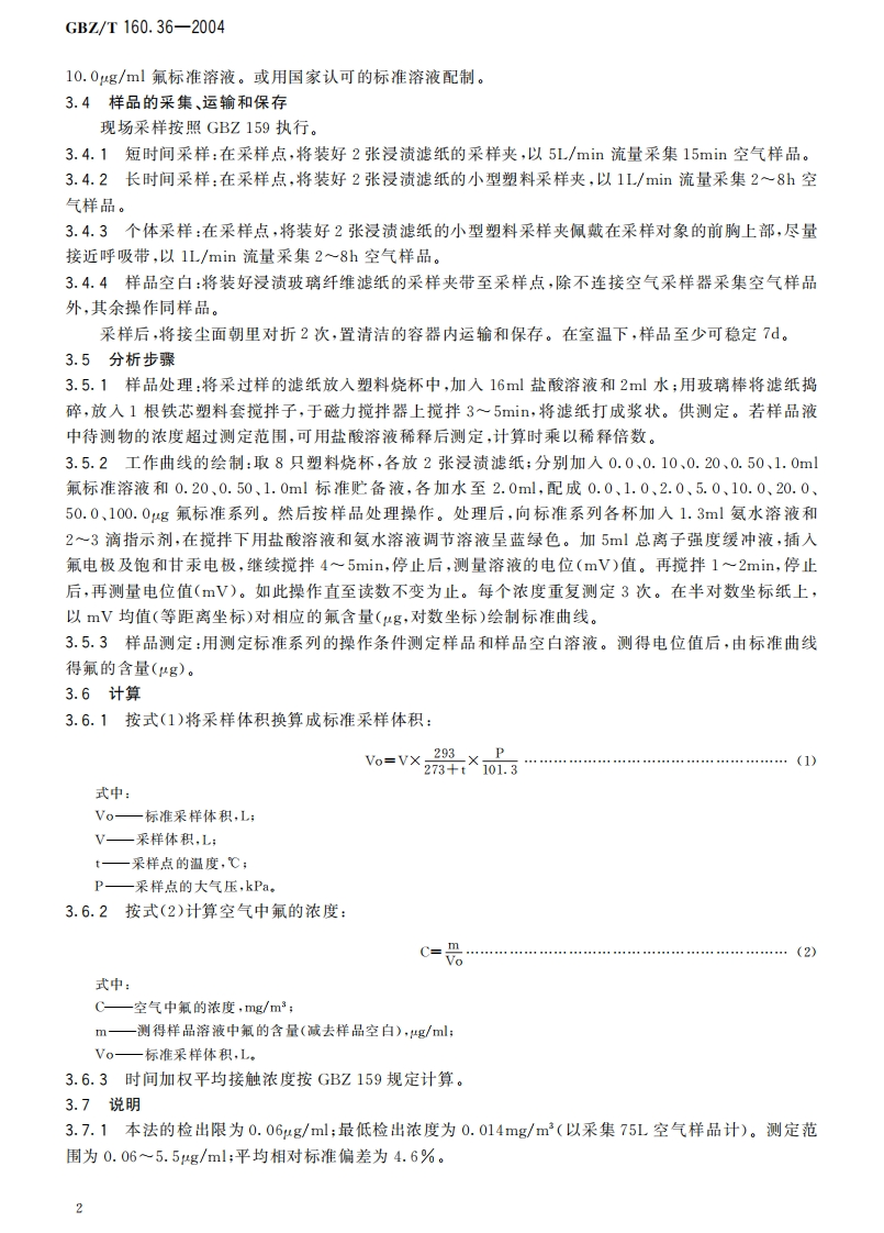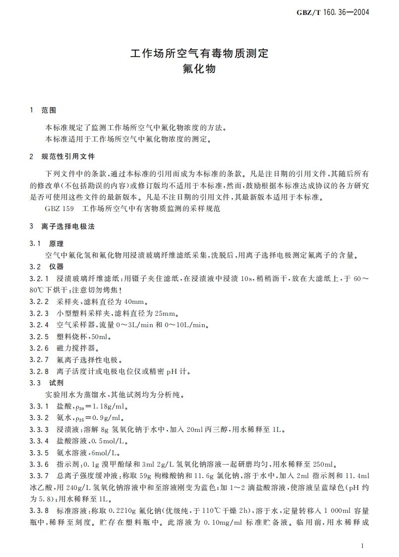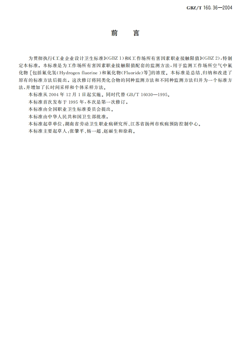 工作场所空气有毒物质测定氟化物Methodsfordeterminationoffluoridesintheairofworkplace348072@abc4天前发布关注私信0.24MB6页021工作场所空气有毒物质测定氟化物Methodsfordeterminationoffluoridesintheairofworkplace此内容为付费资源,请付费后查看¥13¥19黄金会员免费钻石会员免费立即购买您当前未登录!建议登陆后购买,可保存购买订单付费资源 第1页 / 共6页 第2页 / 共6页 第3页 / 共6页 第4页 / 共6页 第5页 / 共6页 试读已结束,还剩1页,您可下载完整版后进行离线阅读 THE END标准规范 文本预览 ICs13.100c52GBZ中华人民共和国国家职业卫生标准GBZ/T160.36-2004工作场所空气有毒物质测定氟化物Methods for determination of fluoridesin the air of workplace2004-05-21发布2004-12-01实施中华人民共和国卫生邻发布 查看更多 收起部分 喜欢就支持一下吧收藏