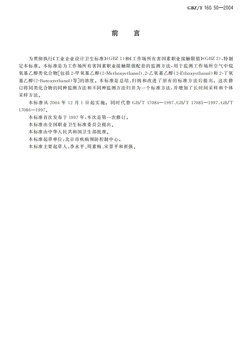 工作场所空气有毒物质测定烷氧基乙醇类化合物Methodsfordeterminationofalkoxyethanolsintheairofworkplace348072@abc4天前发布关注私信0.21MB5页021工作场所空气有毒物质测定烷氧基乙醇类化合物Methodsfordeterminationofalkoxyethanolsintheairofworkplace此内容为付费资源,请付费后查看¥13¥19黄金会员免费钻石会员免费立即购买您当前未登录!建议登陆后购买,可保存购买订单付费资源 第1页 / 共5页 第2页 / 共5页 第3页 / 共5页 第4页 / 共5页 第5页 / 共5页 已完成全部阅读,共5页 THE END标准规范 文本预览 ICs13.100c52GBZ中华人民共和国国家职业卫生标准GBZ/T160.50-2004工作场所空气有毒物质测定烷氧基乙醇类化合物Methods for determination of alkoxyethanolsin the air of workplace2004-05-21发布2004-12-01实施中华人民共和国卫生邻发布 查看更多 收起部分 喜欢就支持一下吧收藏
