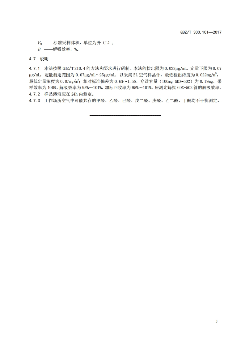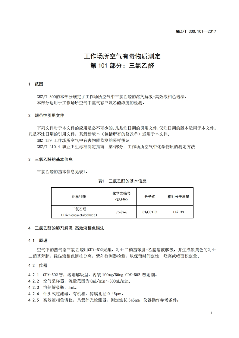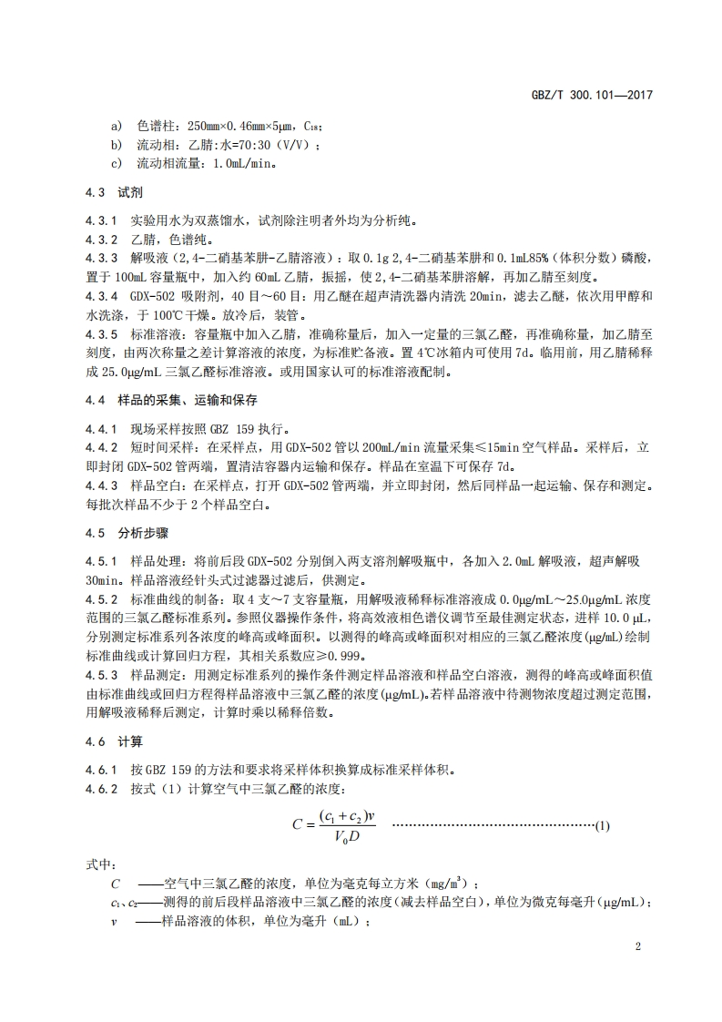 工作场所空气有毒物质测定第101部分_三氯乙醛Determinationoftoxicsubstancesinworkplaceair-Part101_Trichloroacetaldehyde348072@abc5天前发布关注私信0.35MB5页023工作场所空气有毒物质测定第101部分_三氯乙醛Determinationoftoxicsubstancesinworkplaceair-Part101_Trichloroacetaldehyde此内容为付费资源,请付费后查看¥13¥19黄金会员免费钻石会员免费立即购买您当前未登录!建议登陆后购买,可保存购买订单付费资源 第1页 / 共5页 第2页 / 共5页 第3页 / 共5页 第4页 / 共5页 第5页 / 共5页 已完成全部阅读,共5页 THE END标准规范 文本预览 ICS13.100C52FEZ中华人民共和国国家职业卫生标准GBZ/T300.101-2017部分代替GBZ/T160.54一2007工作场所空气有毒物质测定第101部分:三氯乙醛Determination of toxic substances in workplace air-Part 101:Trichloroacetaldehyde2017-11-09发布2018-05-01实施中华人民共和国国家卫生和计划生育委员会发布 查看更多 收起部分 喜欢就支持一下吧收藏
