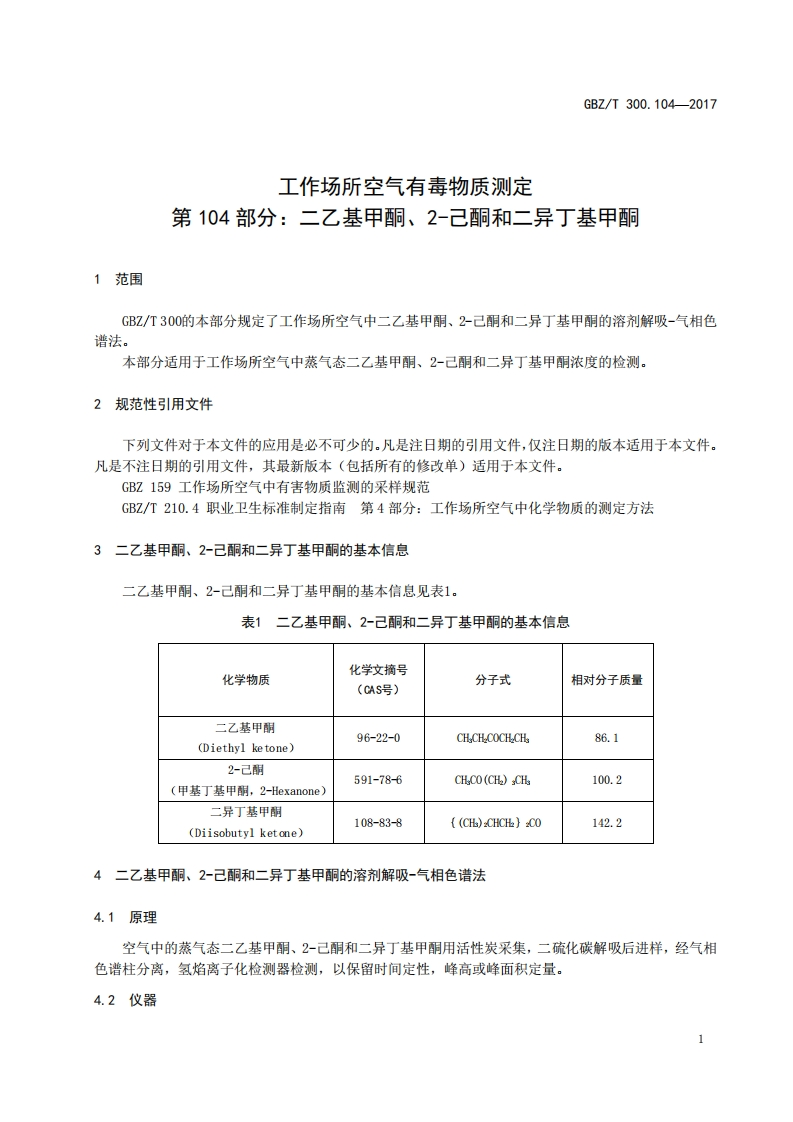 ICS13.100C52GBZ中华人民共和国国家职业卫生标准GBZ/T300.104—2017部分代替GBZ/T160.55一2007工作场所空气有毒物质测定第104部分:二乙基甲酮、2-己酮和二异丁基甲酮Determination of toxic substances in workplace air-Part 104:DiethyI ketone,2-hexanone and di isobutyl ketone2017-11-09发布2018-05-01实施中华人民共和国国家卫生和计划生育委员会发布