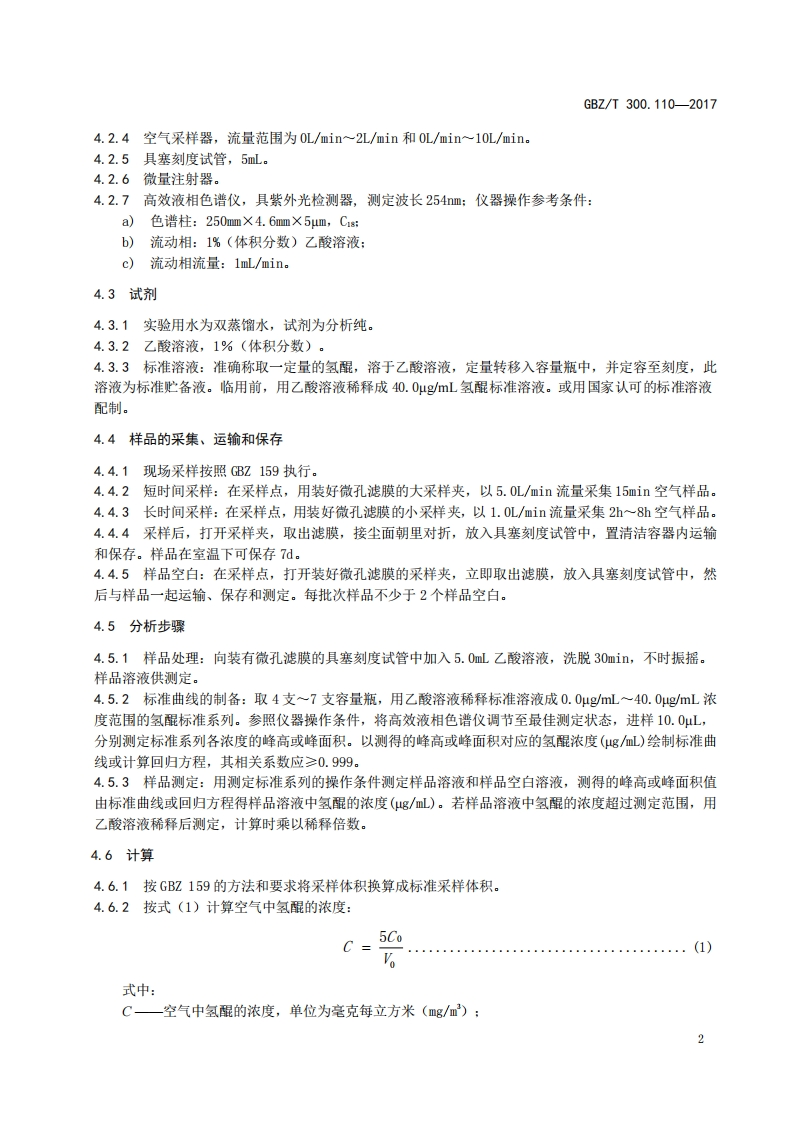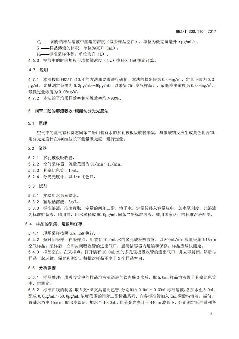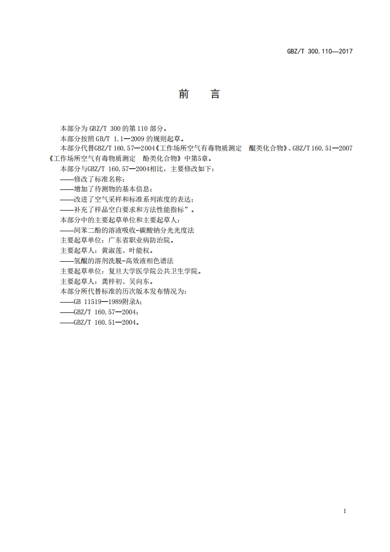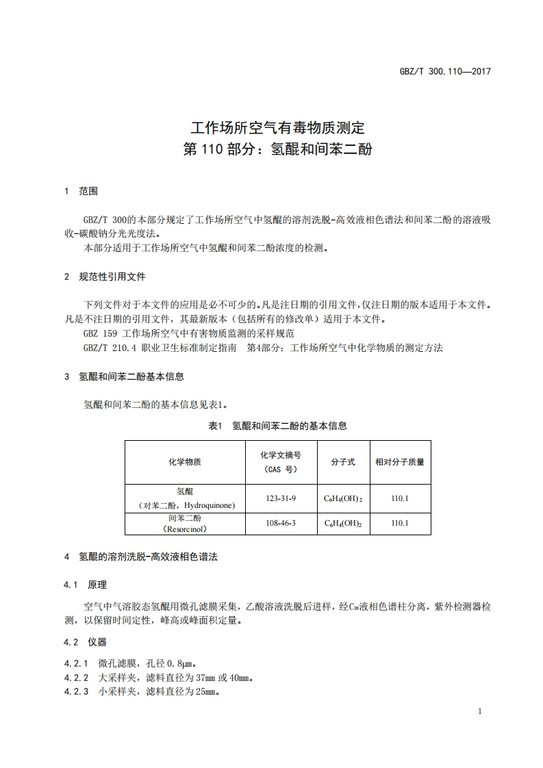 ICS13.100C52FEZ中华人民共和国国家职业卫生标准GBZ/T300.110-2017代替GBZ/T160.57一2004部分代替GBZ/T160.51-2007工作场所空气有毒物质测定第110部分:氢醌和间苯二酚Determination of toxic substances in workplace air-Part 110:Hydroquinone and resorcinol2017-11-09发布2018-05-01实施中华人民共和国国家卫生和计划生育委员会发布